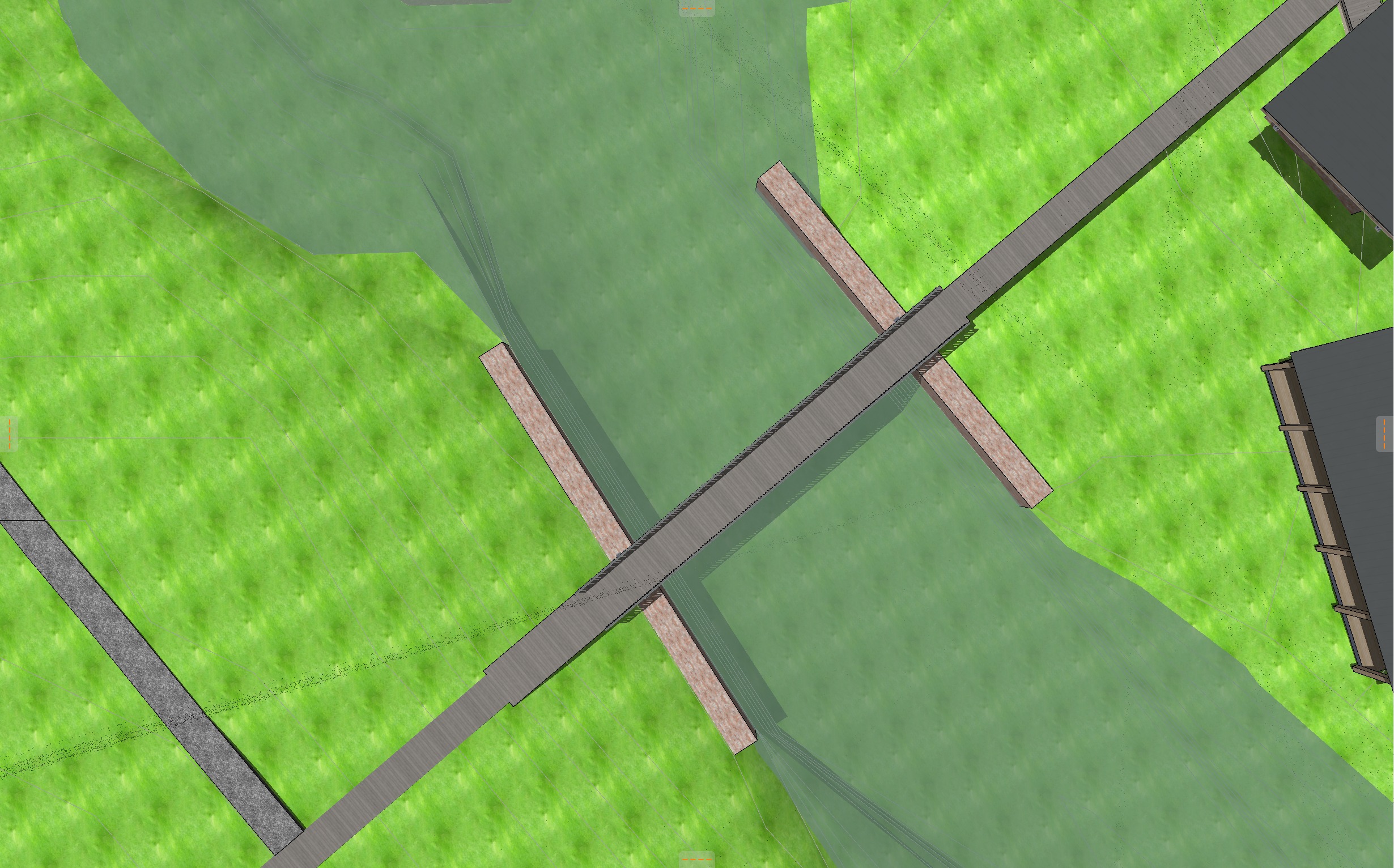 detail shot of an antique brick retaining wall with a soldier course at the top of brick walls with steel beams supporting a steel bridge landscape to be tall wild louisiana grasses and wildflowers yellow pine trees lake inlet passing under bridge in the foreground with 2 people in the water on kayaks