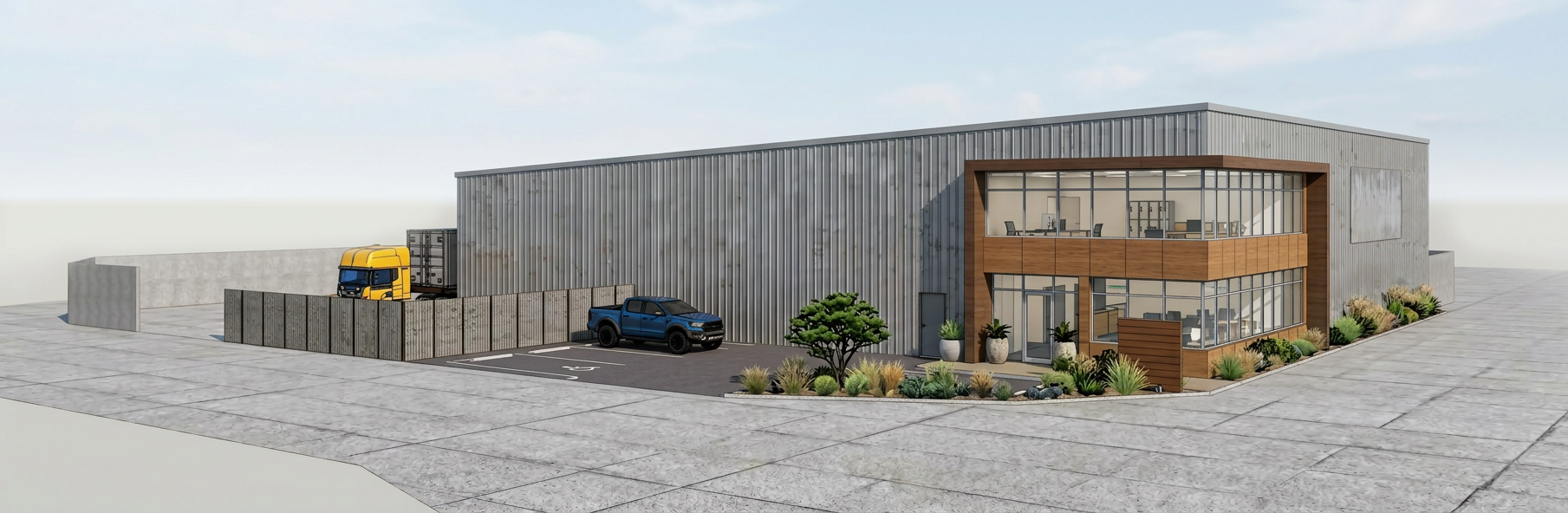 the house should be white with a silver metal roof and palm trees should be placed so that they do not overly block the view emphasize the stairs on the left side