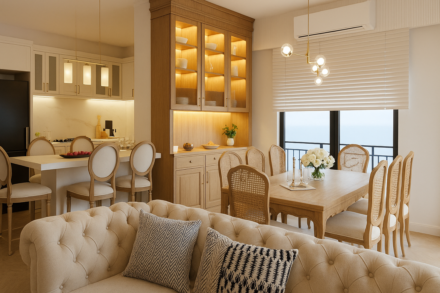 enhance the uploaded interior image for maximum realism while keeping all materials colors object models and dimensions exactly the same realism improvements increase global illumination for a brighter more natural daylight atmosphere avoid dark shadows create a soft balanced light distribution across the kitchen and dining area add realistic reflections and subtle surface highlights without altering textures led lighting turn on all led strips inside the glass front display cabinet shelves every shelf should have a continuous warm white led glow add a soft under cabinet led light beneath the kitchen countertop for a clean and elegant illumination ensure leds look warm daylight tone not too yellow or too cold window outdoor view make the window glass more realistic by adding a visible sky and a subtle outdoor landscape keep it soft and natural not overpowering add gentle daylight rays entering through the window to enhance realism overall look do not change colors of cabinets chairs countertop floor blinds or any object do not modify ebat model or composition only increase realism brightness clarity and lighting quality produce a high end luxury photorealistic result suitable for dilanur topkaya mimarl k