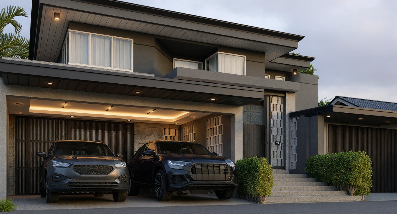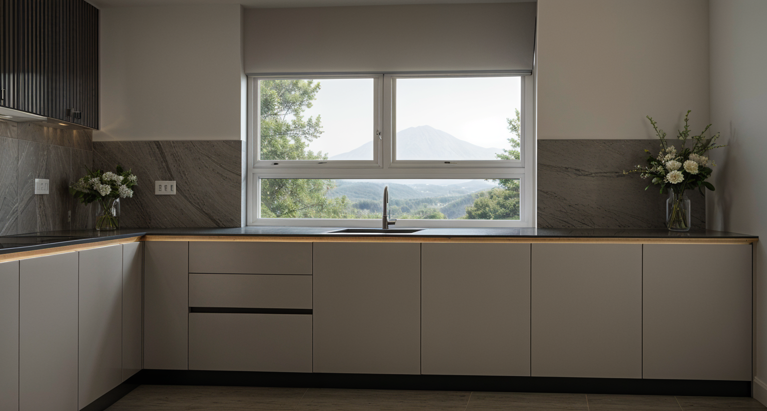 watercolor architectural rendering with soft edges that fade naturally into the paper similar to hand painted architectural illustrations depict the view from an upper balcony of a two story mountain research facility use gentle washes subtle gradients and loose watercolor edges around the outer perimeter of the image show the tall fa ade on the left clad in matte black metal panels with vertical seams and narrow neutral colored horizontal windows no warm interior glow above depict a smooth curved black corrugated metal roof cantilevering outward the underside should wrap continuously over the balcony not appear as a vertical wall include small recessed box like openings aligned with the balcony floor the balcony should have modern minimal railings thin black steel framing with transparent glass panels clearly visible but delicate consistent with watercolor linework the floor is light polished concrete rendered with soft desaturated washes beyond the balcony illustrate a bright high elevation mountain landscape a steep cliff drops into pale fog and low clouds in the distance show large blue gray mountain ranges softened with atmospheric watercolor haze add faint pine trees and rocky slopes on the lower terrain overall lighting should be bright airy neutral daylight avoid dark or cool tones render in a classic watercolor architectural style with soft outlines gentle shading and the image fading away at the edges