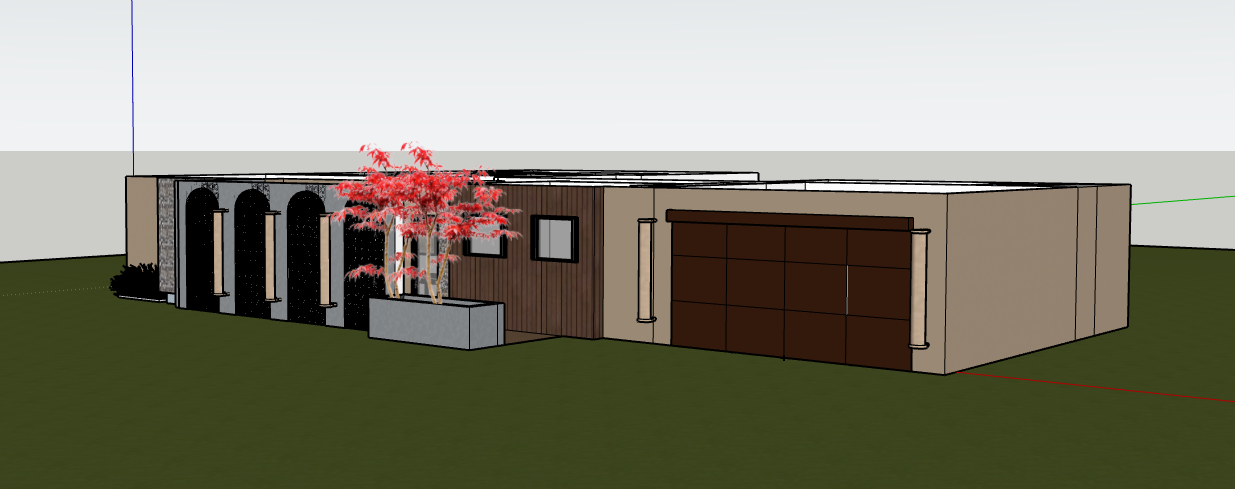 make a photorealistic rendering of this house with a classic pitched roof and trees in the background