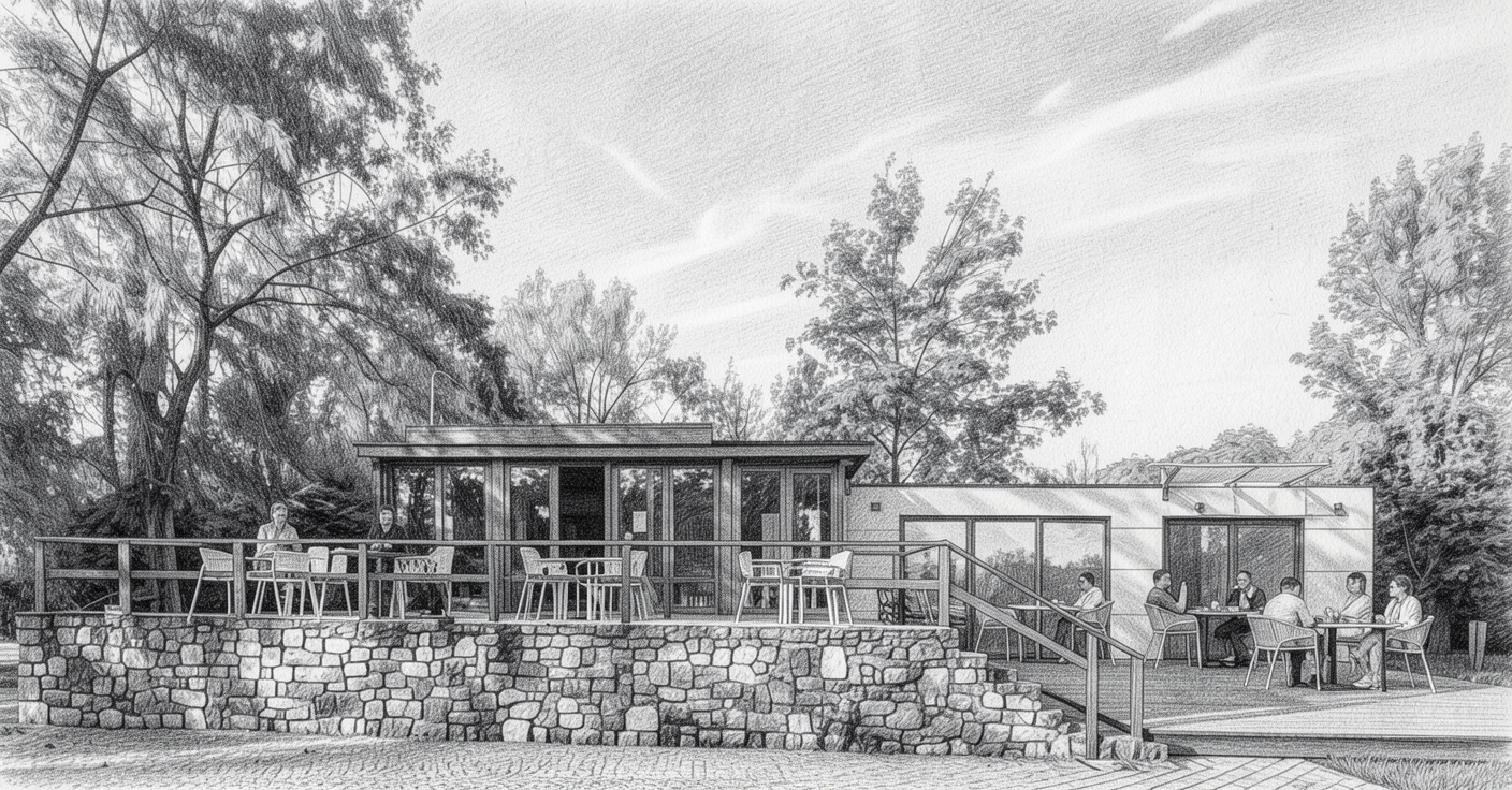 add the text samen nieuwe energie cre ren to the left side of the building on the wooden outside facade make this text white