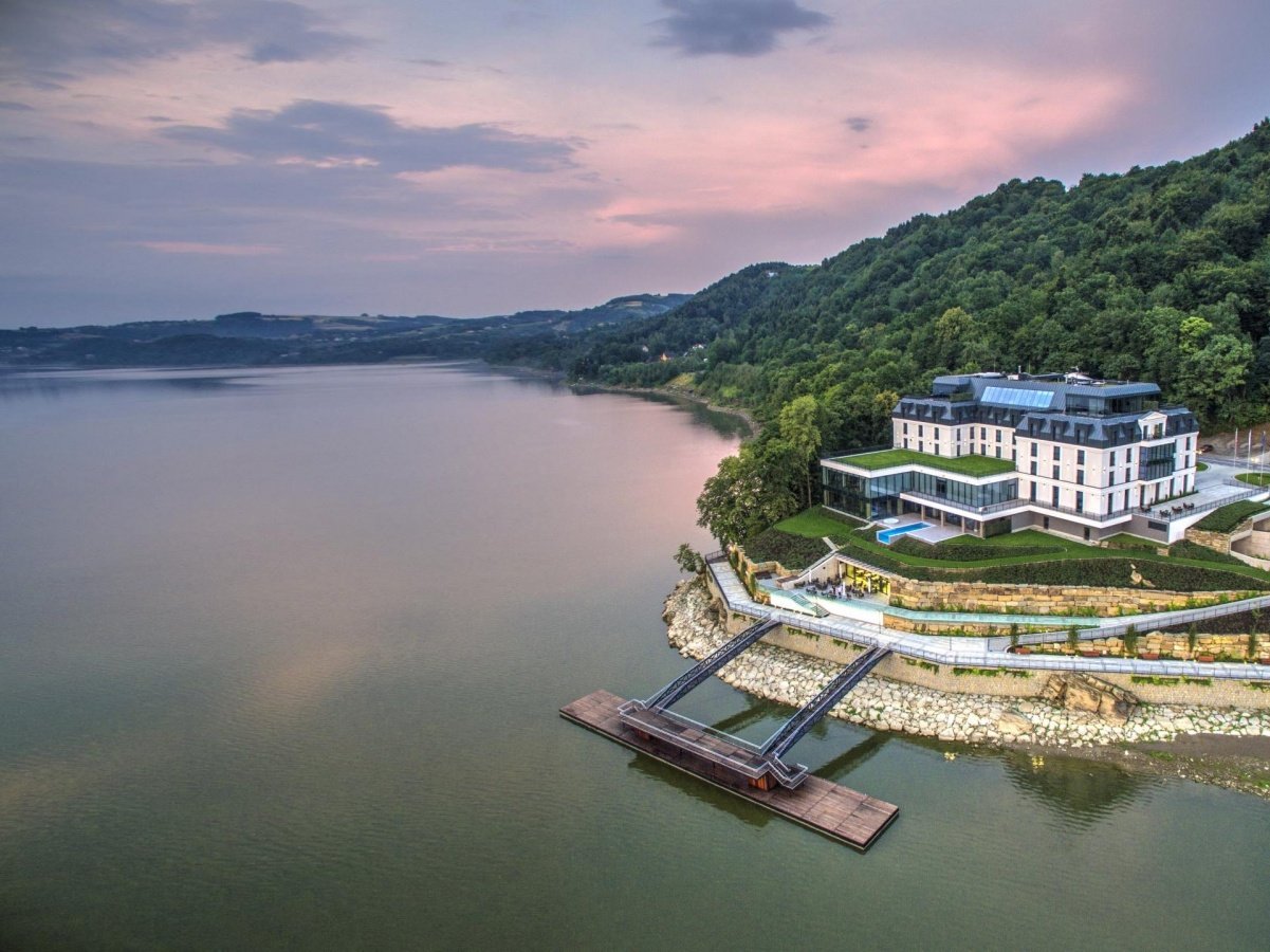 enhance this aerial photo of a lakeside hotel complex keep the exact geometry proportions and composition of all buildings terraces retaining walls paths docks landscape and shoreline do not move remove or add any architectural or landscape elements do not change the design style materials colors or shapes of the building roofs glass pavements walls vegetation or water goals sharpen and upscale the image to high resolution with crisp realistic details improve lighting for a realistic high end architectural visualization look soft late afternoon sunset light gentle warm tones on the building fa ades and subtle reflections on the lake surface enhance realism of materials glass plaster metal stone greenery water with better contrast and micro details without altering their original color palette slightly increase clarity depth and dynamic range but avoid hdr or over saturated fantasy colors reduce noise banding and any compression artifacts while maintaining a natural photographic look absolutely no changes to geometry layout massing colors materials or camera angle only quality realism lighting and detail enhancement