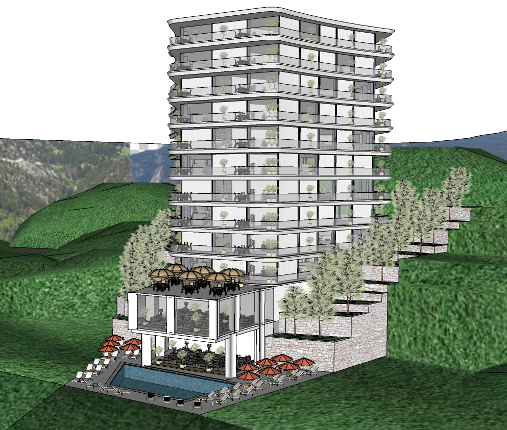 a modern high rise building on a lush green hillside the structure is sleek and futuristic with smooth curved lines and white and light gray concrete exterior the balconies are adorned with small potted trees adding a touch of greenery at the base of the building there s a spacious terrace with tables and orange umbrellas the pool is a shimmering deep blue surrounded by elegant lounge chairs the ocean is a tranquil azure blue with gentle waves lapping against the shore the sky is clear creating a serene and refreshing atmosphere perfect for a luxurious getaway there are a few modern low buildings around