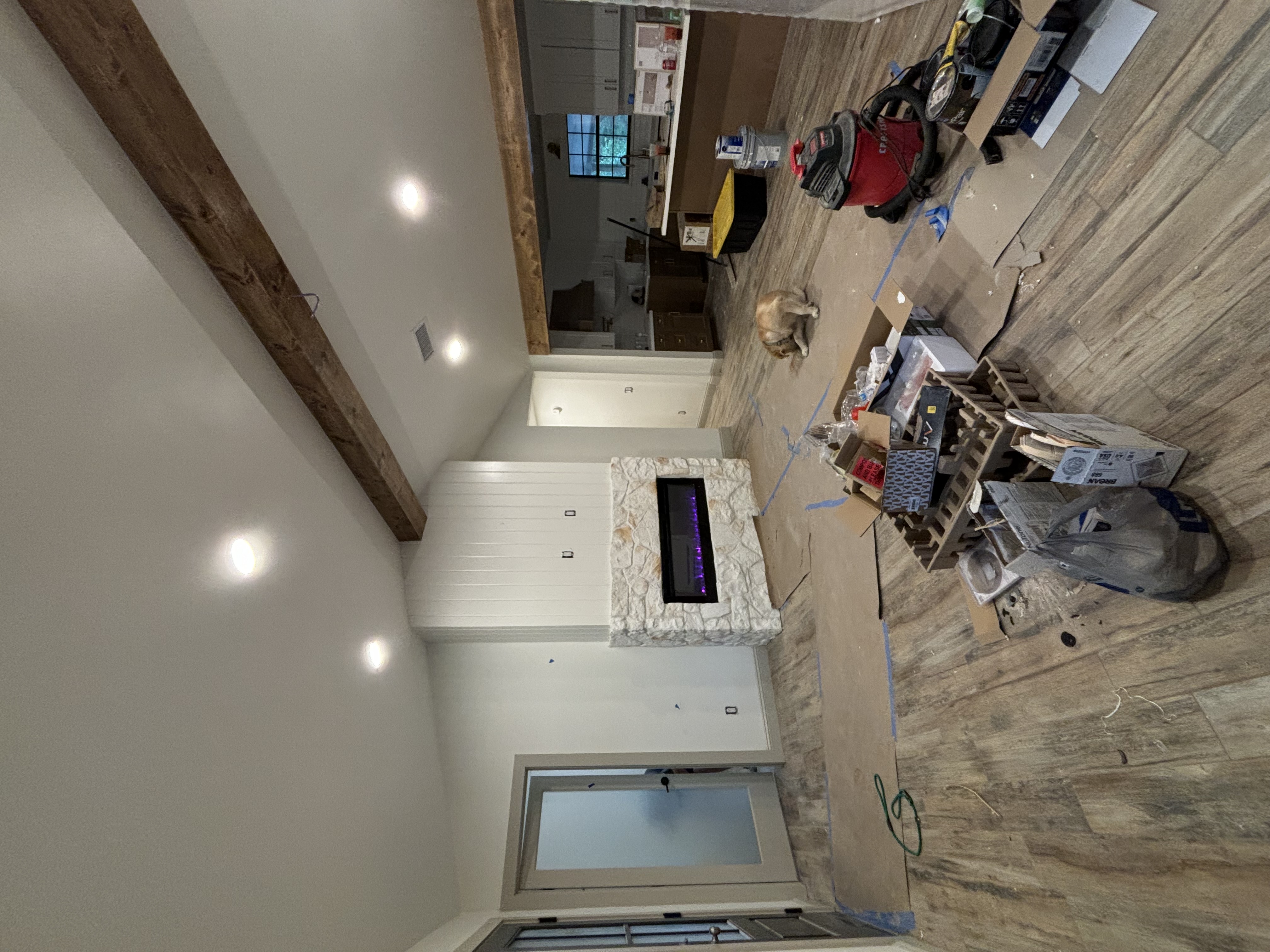 add a black ceiling fan centered in the beam with no light kit clean up the living room and add contemporary furniture add a stained wood mantel to the fireplace
