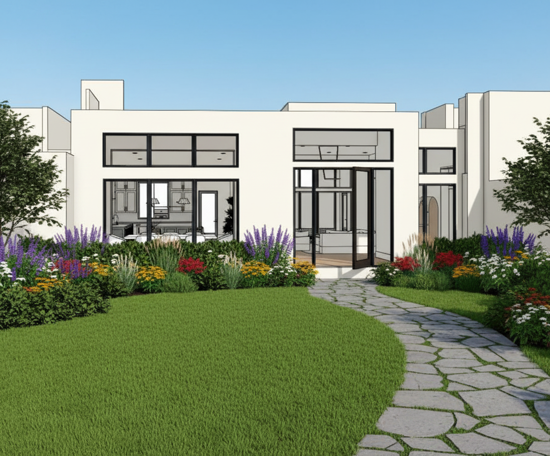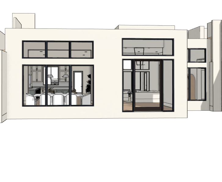 create a modern architectural exterior design of a house with large windows and flat roof use a cream colored facade with sleek black window frames inside reveal a contemporary minimalist interior with shades of white and soft gray the atmosphere is elegant and serene capturing the beauty of natural light pouring through the windows add a touch of greenery visible through the glass to enhance the tranquil feel