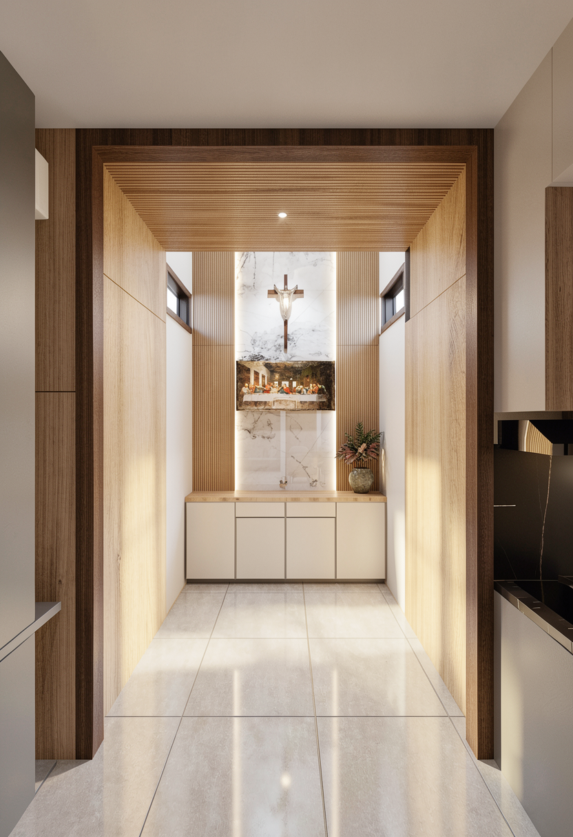 backsplash and table top is matt surface flooring is light beige matt tiles in 800x800mm top hung cabinet in cream white finish right side wall tiles in matt light beige color cabinet beside fridge using the same light wood as the bottom cabinet