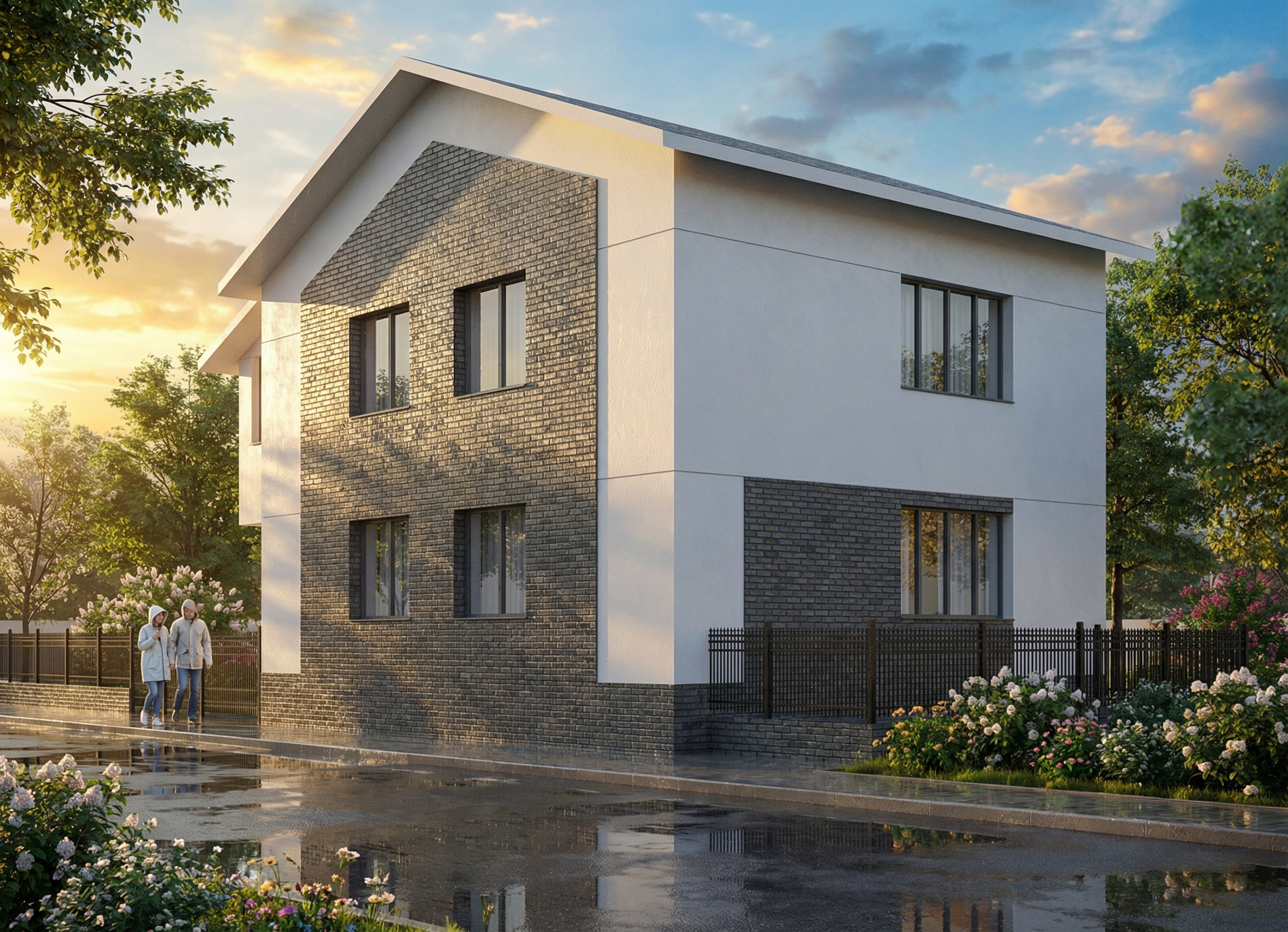 use this view to create a realistic 3d view of the kitchen which opens to the bright living stylish room gentle sunlight enters the room creating light shadows and a pleasant atmosphere add glasses plates etc to the countertop an elegantly dressed woman in a dark evening gown stands at the kitchen island holding a glass of white wine keep the colors of thek kitchen materials as in the provided view