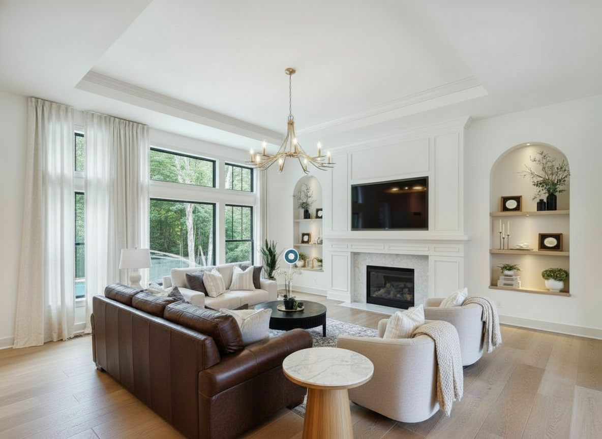 create a hyper realistic visual of this architects designed house the front driveway is a cream resin bound and add planting to the foreground and trees in the background behind the house the bricks of the house are red flemish bond and the roof is red hand made clay tiles