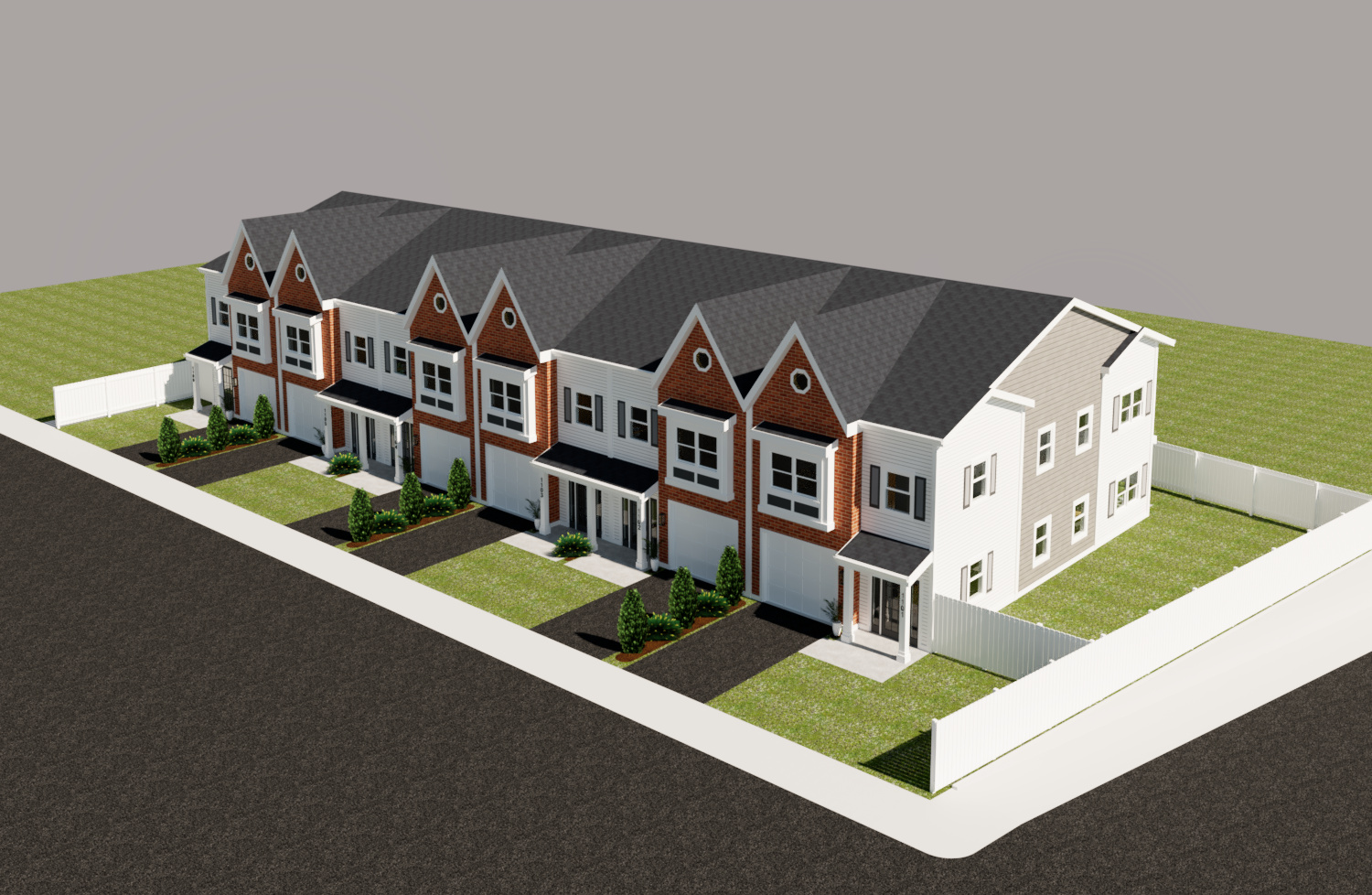 lock the geometry and pixels of the integrity of the building and camera view enhance the quality of the materials and colors add trees to the left side of the left white picket fence add tennis courts behind the building and single family homes in the distance add a blue sky with some clouds make whole image photorealistic do not change the materials that are shown