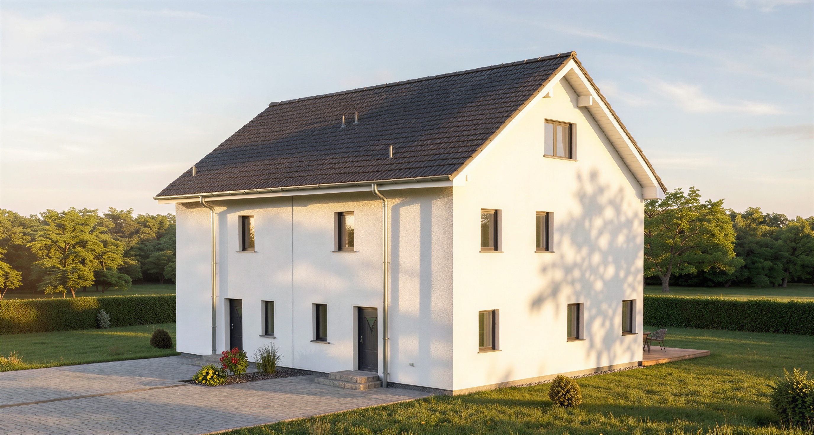 erstelle f r dieses bild eine realistische hausansicht mit wei er fassade und tageslichtstimmung