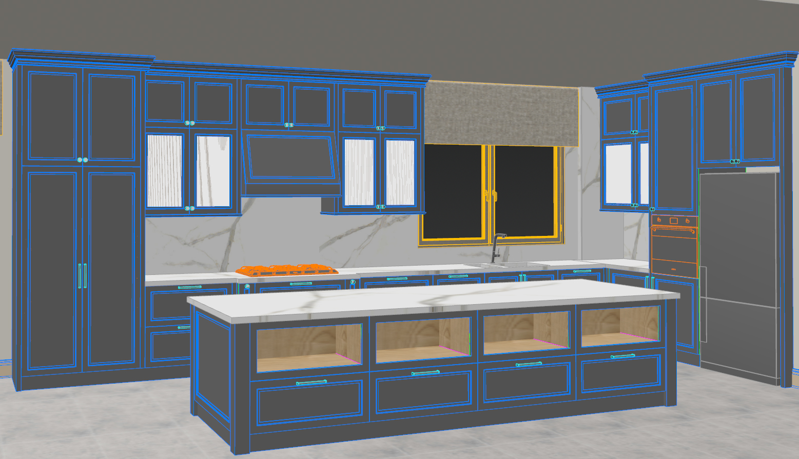 there should be spot lighting on the ceiling there should be led lighting under the upper cabinets the areas with blue stripes should be gray it should be an evening shot