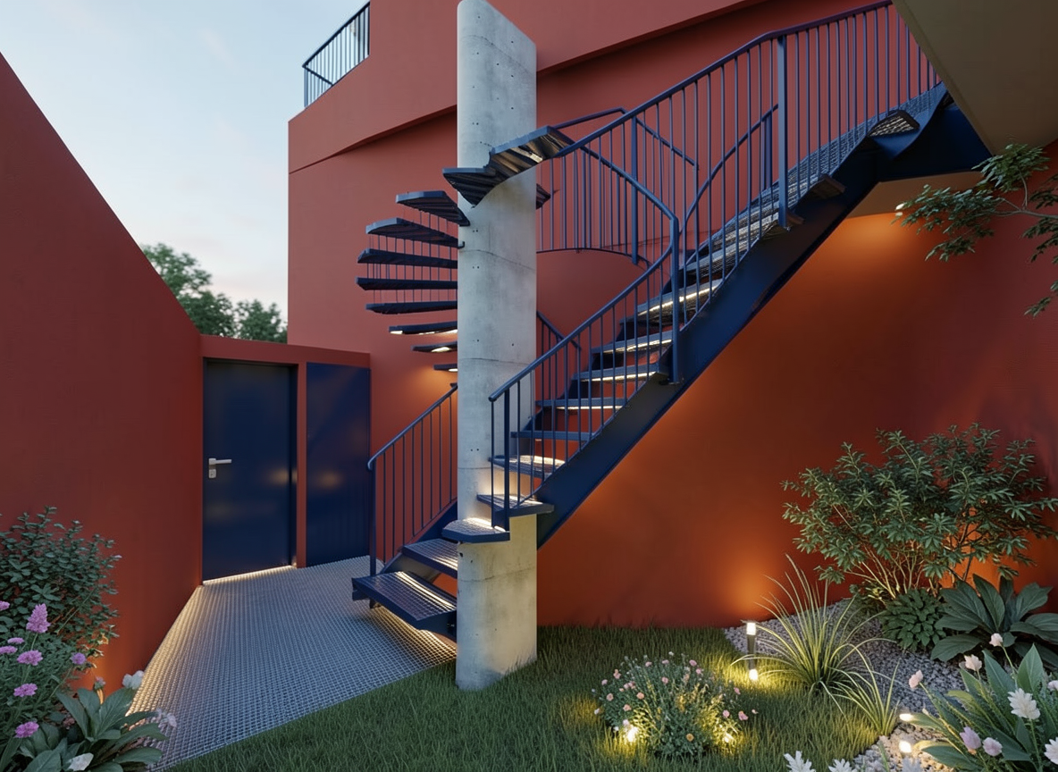 create a 3d photorealistic rendering from this model the staircase with a metal stringer and steps made of irving steel grating the design should look modern with very clean and refined lines include a iron panel railing that feels minimal yet elegant surround the staircase with garden landscaping for ambiance add indirect lighting integrated into the steps to create a subtle glow the metal stringers should be lacquered in a navy blue finish put the door of the elevator to the left side of the stairs