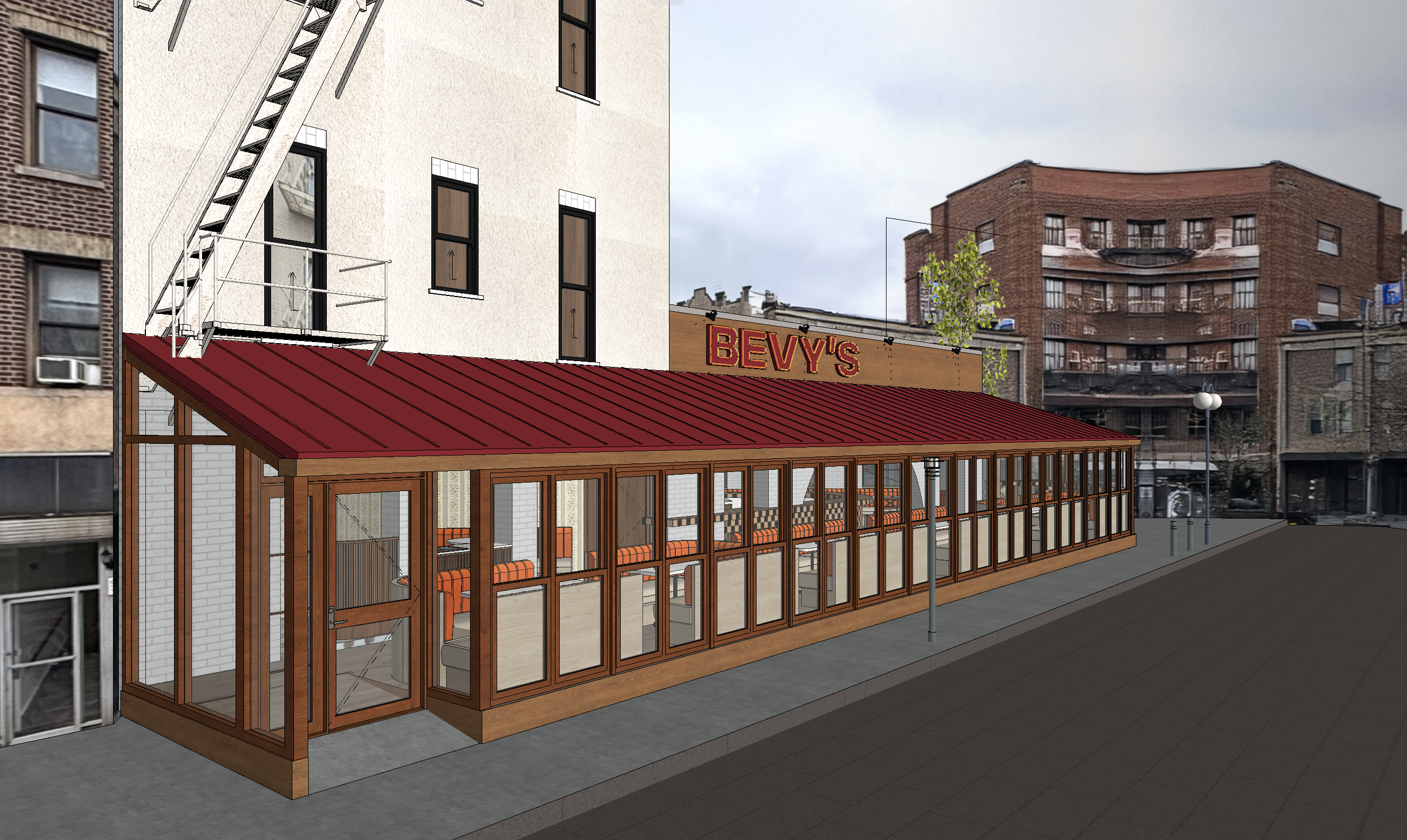 photorealistic summer daytime exterior of the bevis caf in new york with a long glass enclosed terrace wood framed sliding windows wood siding parapet under the glazing deep burgundy metal roof in bright sunlight warm visible interior with orange velvet banquettes clear reflections on the glass crisp shadows soft warm summer light pedestrians and light street activity green leafy trees clean sidewalks and a vibrant new york backdrop with sunlit brick buildings