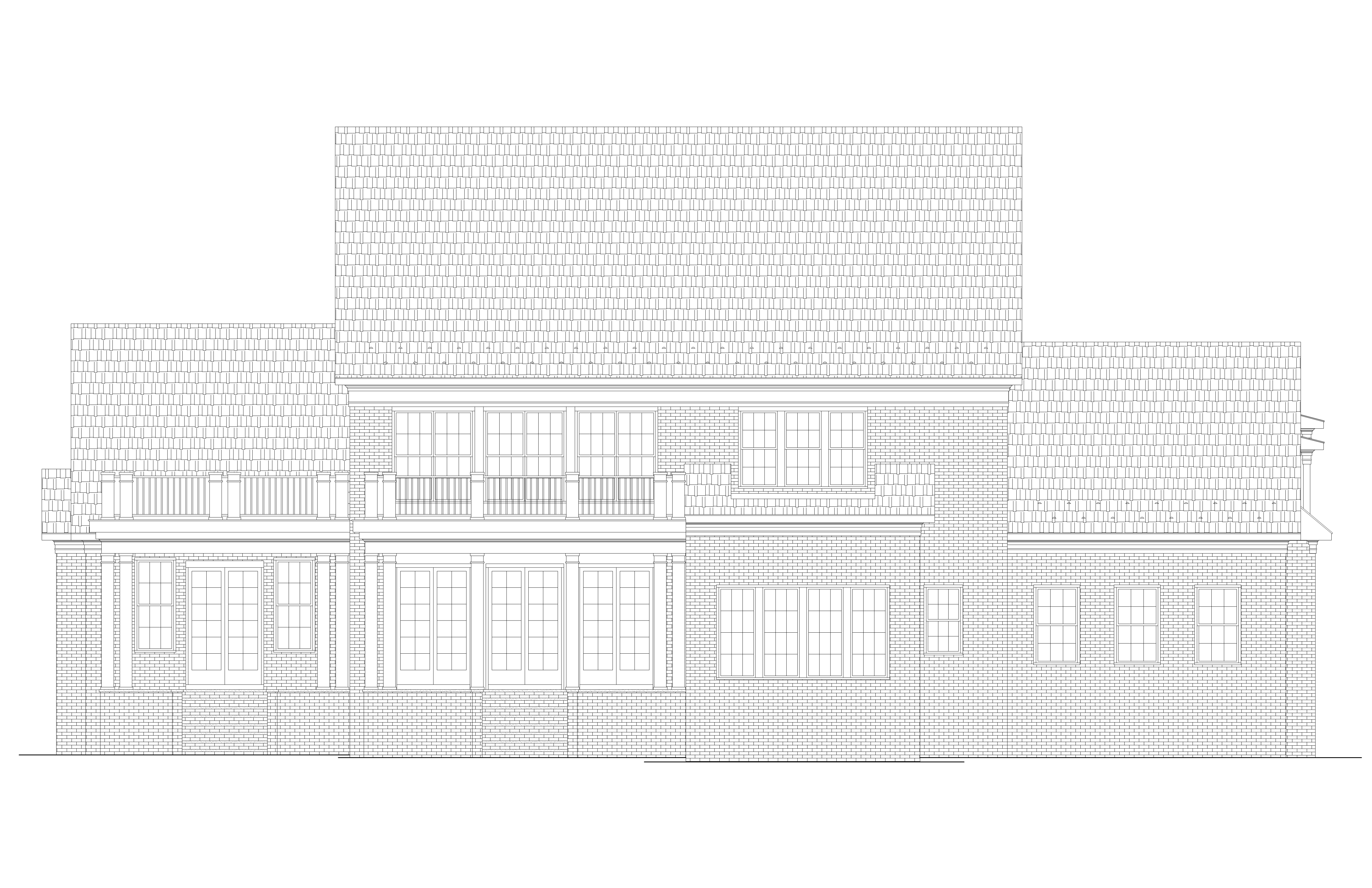 render rear elevation of a charming colonial house with a sophisticated design the roof is composed of warm earthy charcoal shingles contrasted with soft cream colored walls large windows dominate the front with elegant white frames adding a touch of modernity the surrounding environment is lush and inviting with a green lawn and vibrant colorful flowers in bloom the atmosphere is peaceful and serene bathed in the golden light of a setting sun casting long shadows and a warm glow over the scene