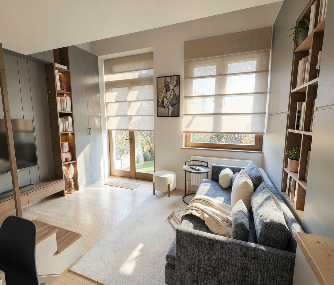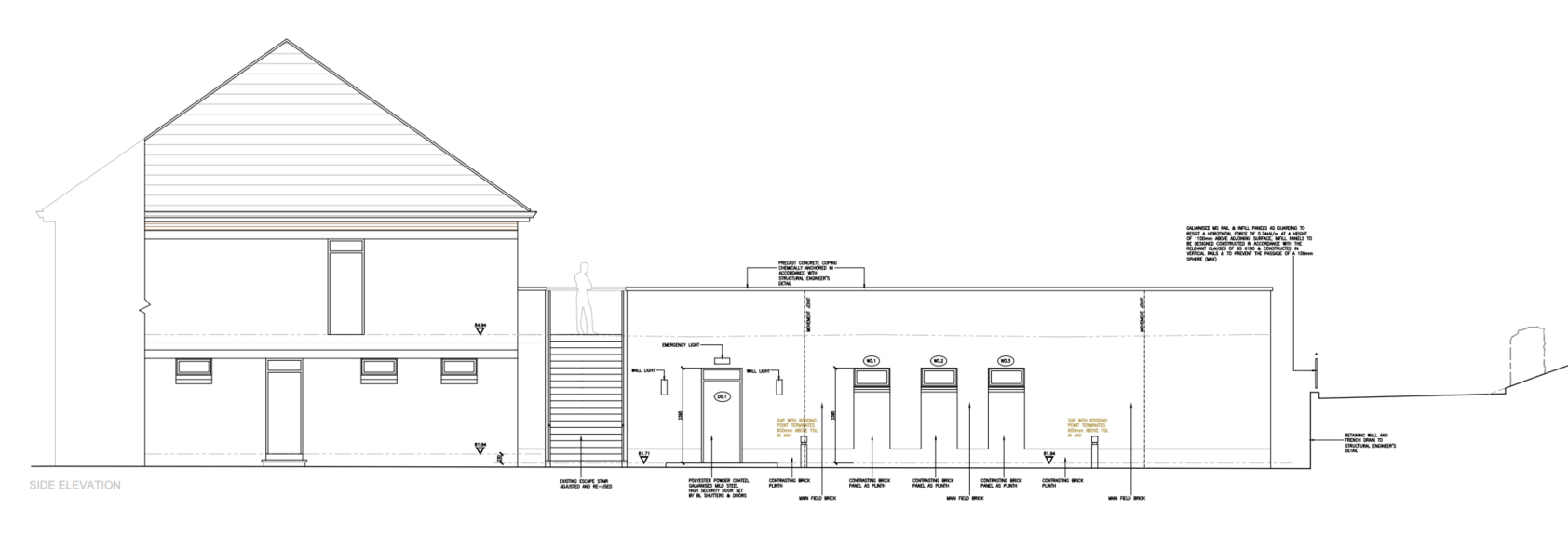 render a modern architectural side elevation with a two story building made of red bricks featuring large windows with black frames incorporate a clean minimalist design with a small outdoor staircase leading to the roof the ground level area should have contrasting dark gray bricks add ambient wall lights in warm yellow tones to create a cozy inviting atmosphere the sky should be clear with a soft pastel sunset palette casting gentle shadows to enhance depth and dimension the overall scene should convey a serene evening ambiance