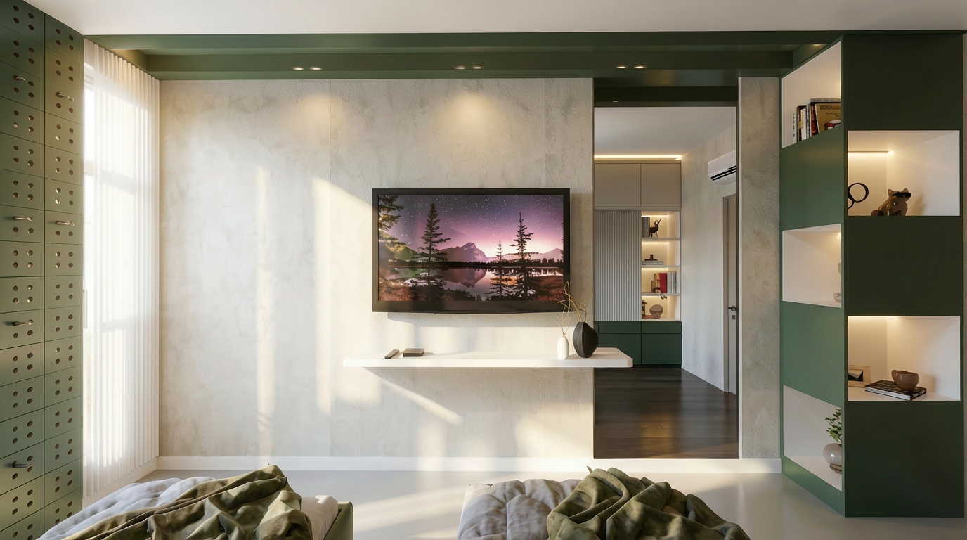 render the scene in high resolution with ultra realistic cinematic lighting preserve all objects colors textures and positions exactly add natural light coming from the window area but do not show the window itself the furniture near the window is white ensure the light feels natural and realistic combine with subtle artificial lights to enhance depth and liveliness maintain olive color slightly darker with balanced cool warm tone velvet texture on the bed headboard and subtle led lights in shelves emphasize simple horizontal wooden flooring parket without reflections do not change anything else ensure mirrors do not reflect the hidden window focus on lifelike atmosphere with natural balanced lighting and subtle highlights