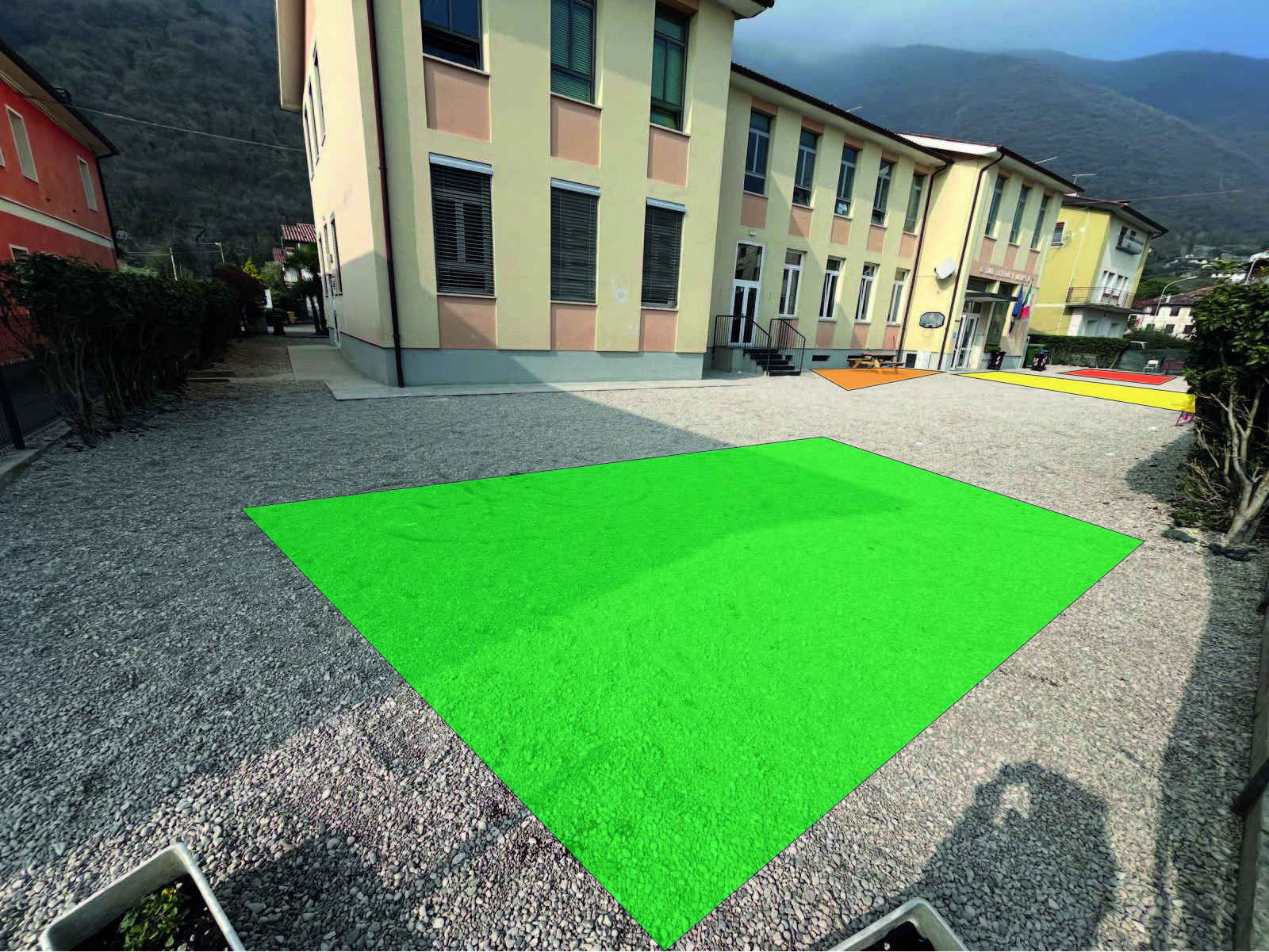 aggiungi nella foto i seguenti elementi pensilina antipioggia nella zona in giallo il castello per bambini nella zona rossa in fondo pavimento antitrauma zona verde campetto da basket con canestro sul muro zona arancione