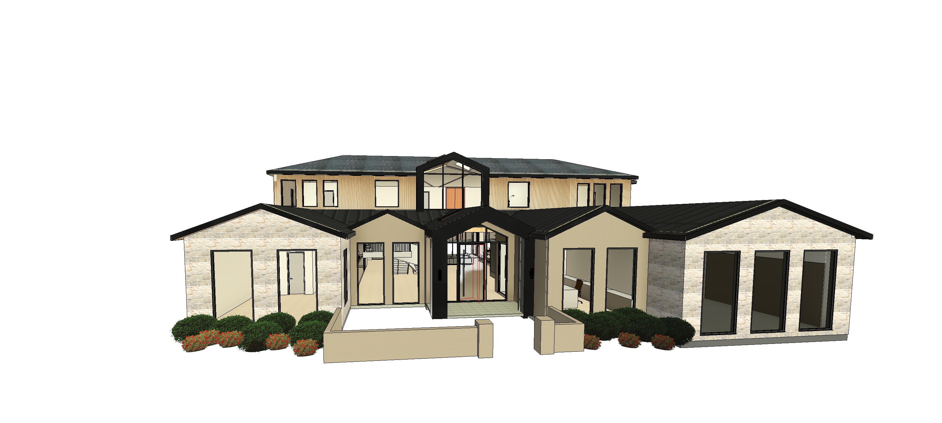 add pavers and driveway in the front more natural tone outdoor shot make all the window and door frames black