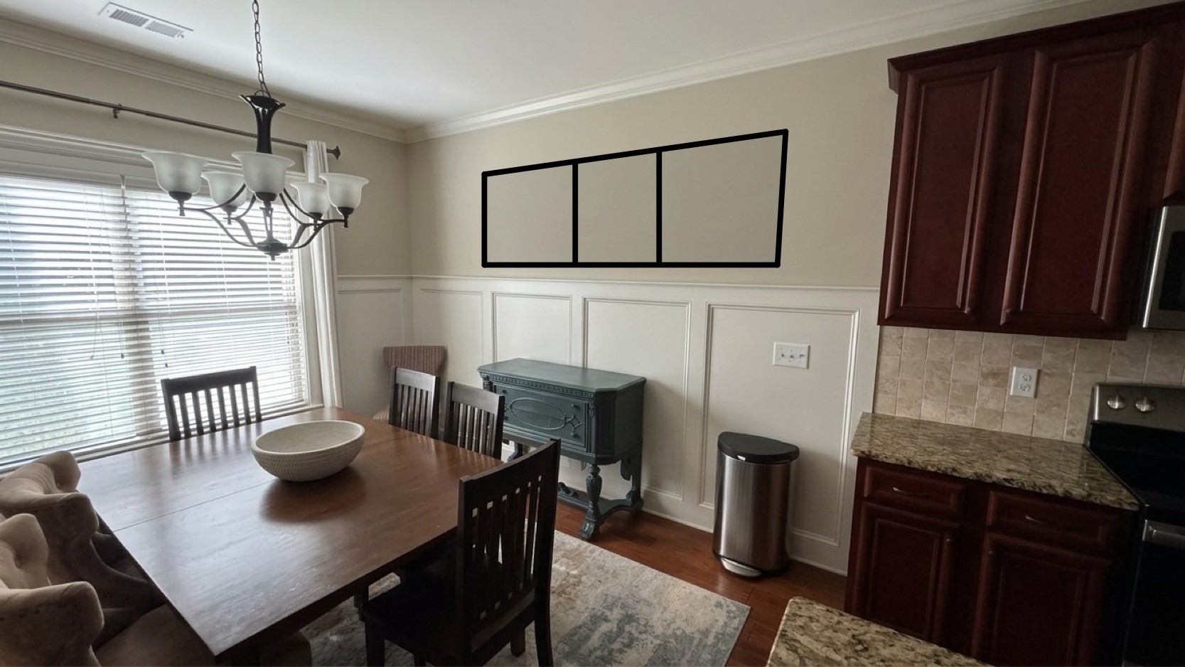 render this interior shot adding a 3 gang fixed window without mullions as indicated by the sketch use the same white colored craftsman trim as the other windows