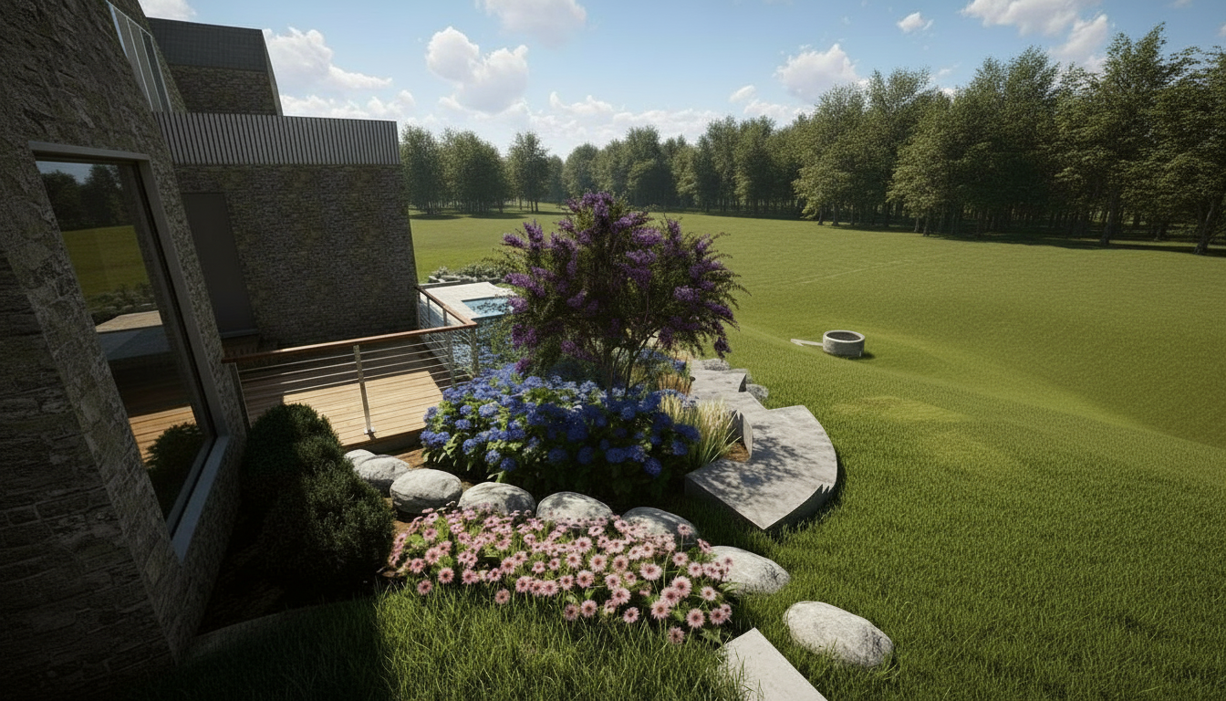 render a picturesque countryside mansion with a striking brick exterior featuring a rich red hue the roof is made of sleek deep charcoal gray shingles the large windows reflect a clear blue sky with hints of soft white clouds surround the mansion with a lush vibrant green lawn under the sunlight casting gentle shadows add a few slender evergreen trees with a darker green tone to complement the landscape capture a serene and sunny afternoon atmosphere emphasizing tranquility and spaciousness