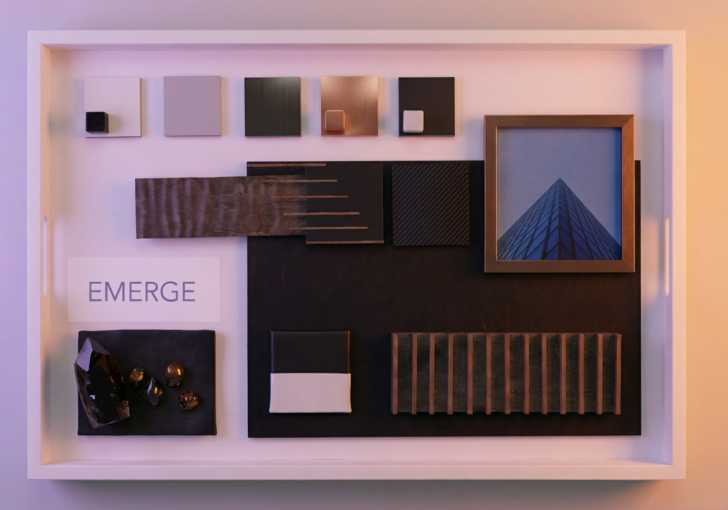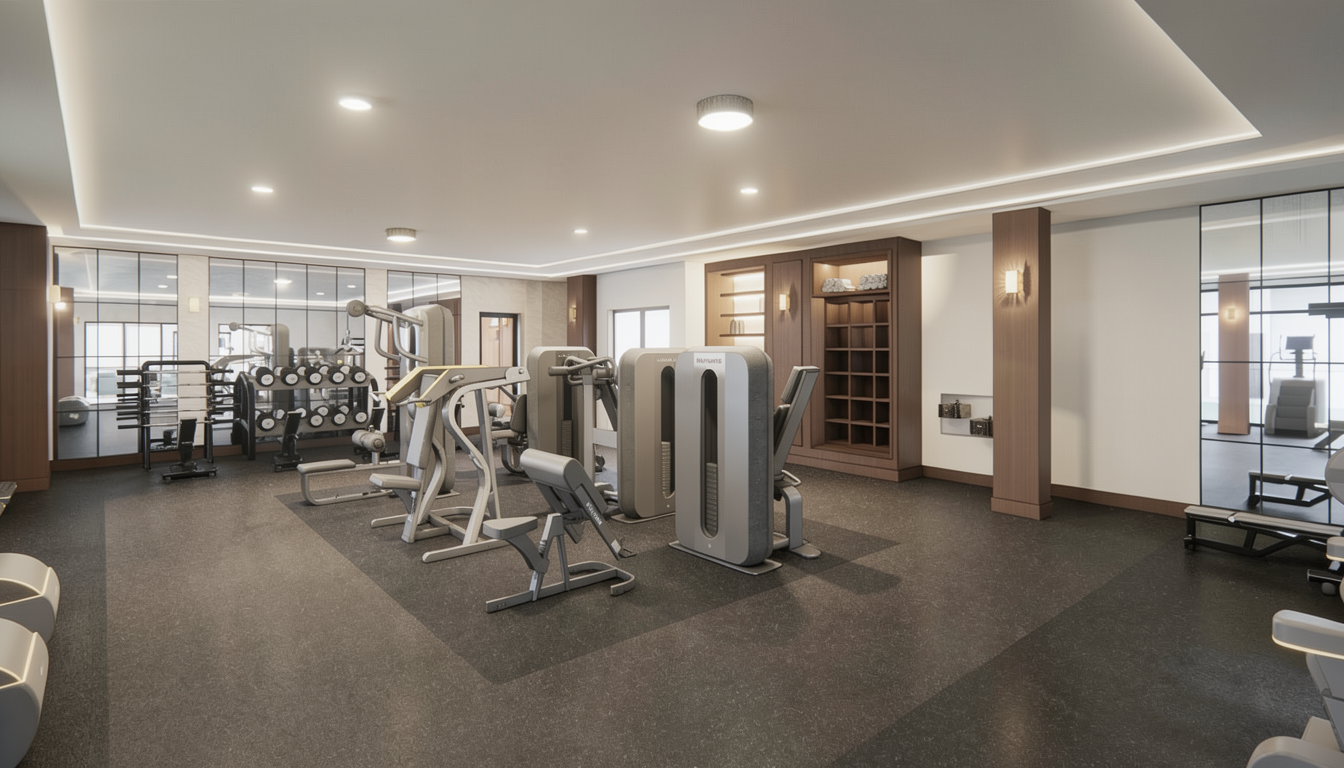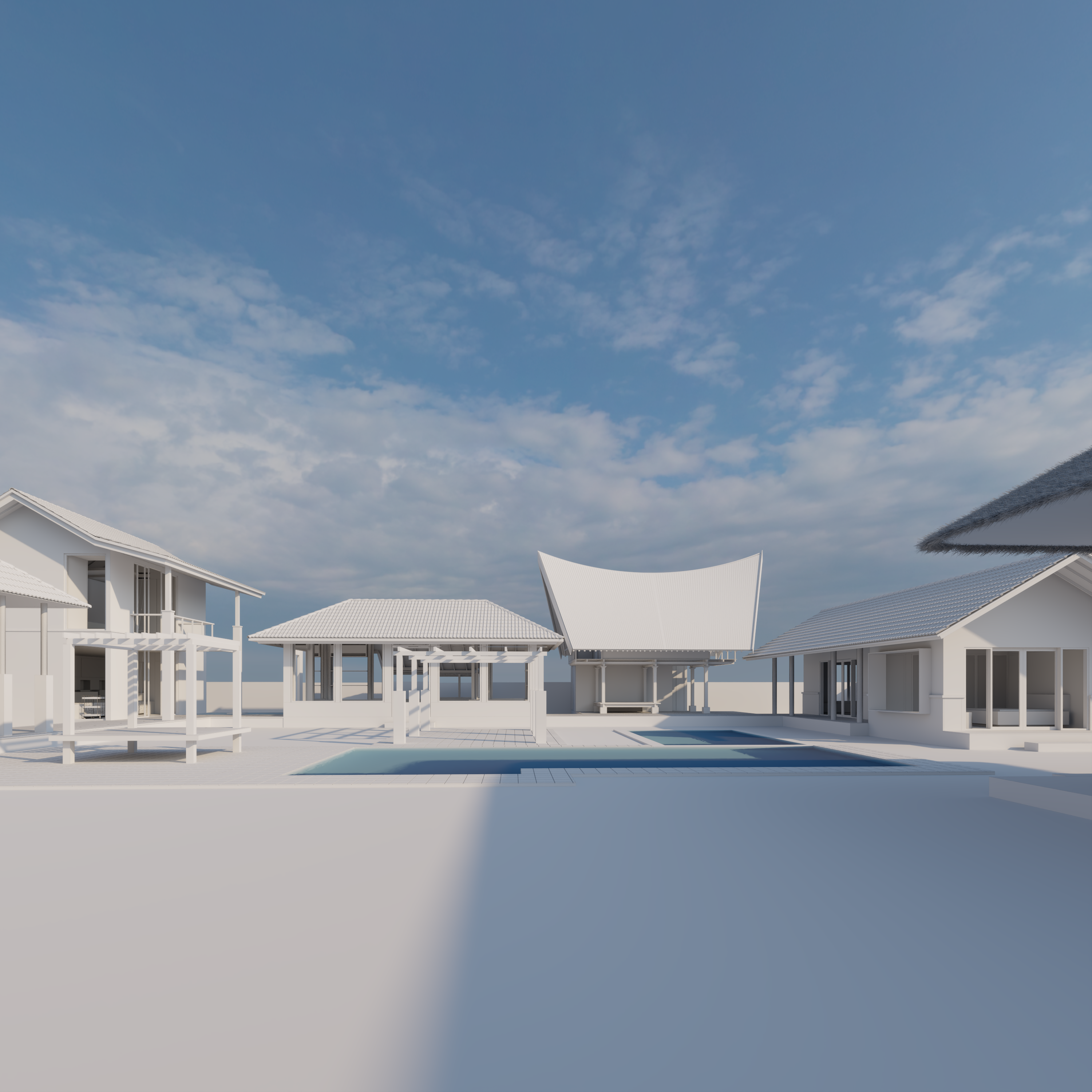 exterior shot contemporary tropical courtyard inspired by japanese restraint and southeast asian lushness captured in early morning with visible dew on leaves and soft humid haze warm golden sunrise filtering through tall fern trees and slender palms casting long delicate shadows on smooth plaster walls architecture minimalist pavilion with clean rectilinear volumes muted warm gray concrete or lime plaster facade deep overhangs dark stone base large glass openings reflecting greenery calm grounded geometry with quiet presence landscape composition layered planting strategy combining fern trees bamboo clusters palms monstera banana leaves heliconia and dense groundcover moss softly creeping between large stone stepping slabs curated balance between structured zen spacing and expressive tropical density water feature shallow reflective pond with lily pads and subtle koi movement linear basalt edge detail thin blade waterfall integrated into wall water surface calm with gentle ripple from falling droplets ground treatment floating stone platforms over water gravel transitions moss carpets manicured tropical lawn pockets atmosphere immersive serene contemplative dew droplets catching light on leaf edges slight morning mist diffusion dappled sunlight through canopy color palette deep layered greens charcoal stone muted earth tones soft gray plaster camera style cinematic architectural photography eye level perspective natural color grading ultra realistic texture detail soft depth of field mood keywords tropical zen sanctuary morning ritual garden modern courtyard retreat balanced lushness quiet immersive landscape