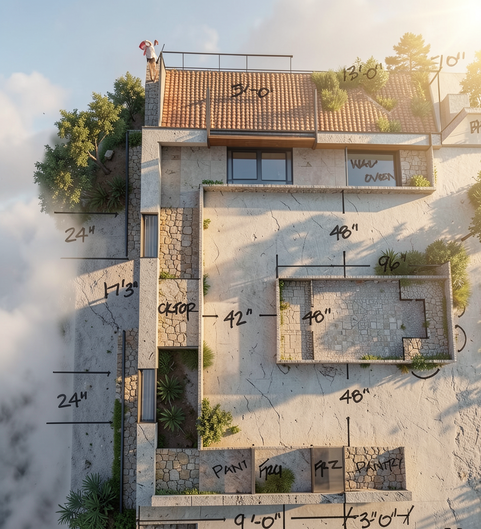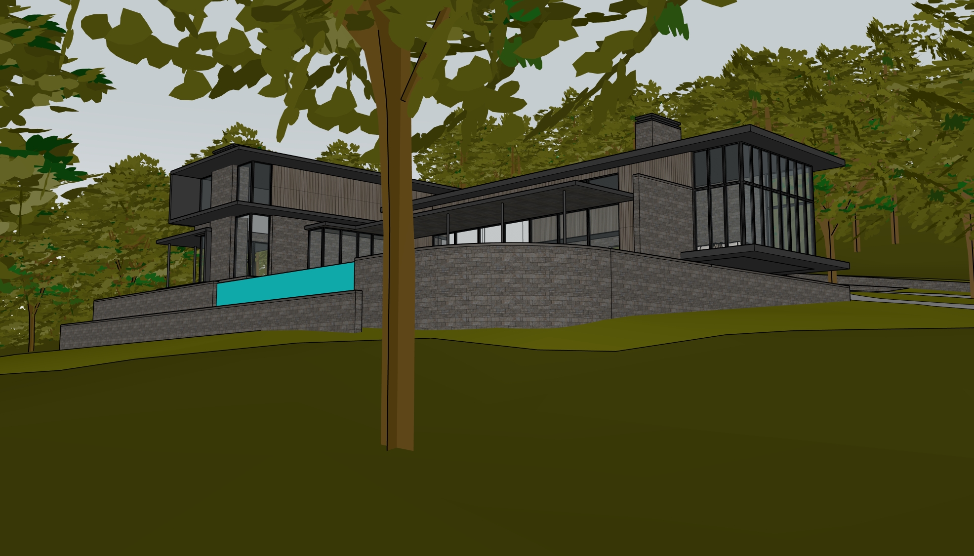 home sits on a hill in a woods do not add any objects the blue surface in the image is a waterfall make the trees in the image more realistic