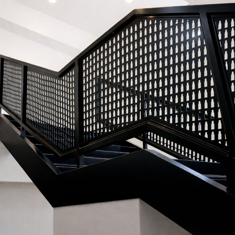create a striking image of a modern staircase featuring intricate black lattice railings with a glossy finish set against a backdrop of soft white walls the ceiling is adorned with subtle recessed lighting casting a warm glow emphasize the sleek geometric design and play with light and shadow to create depth the overall atmosphere should be contemporary and elegant with a focus on clean lines and contrasting colors