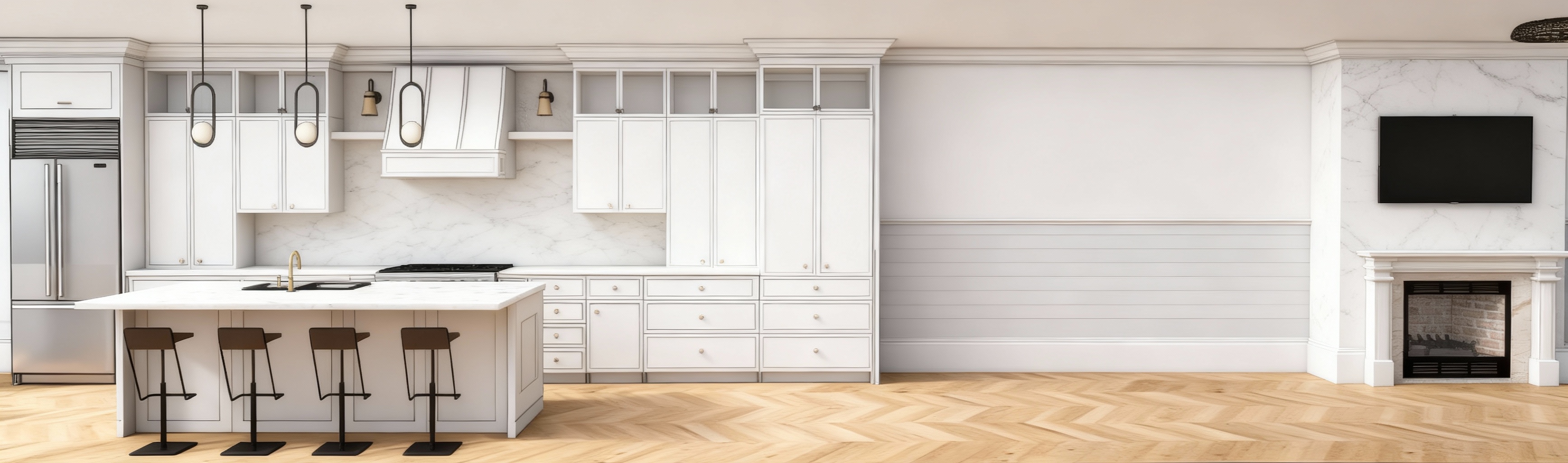 render it with the wall paneling on the fireplace white color wall the backsplash is white marble island countertop is also white marble flooring is light oak texture paint the wall paneling to light grey wall paneling is shiplap only on the grey area shiplap is in vertical direction lighting in the cabinet glass box no ship lap above the chair rail no black border on the cabinet cabinet is benjamin moore oc65 color