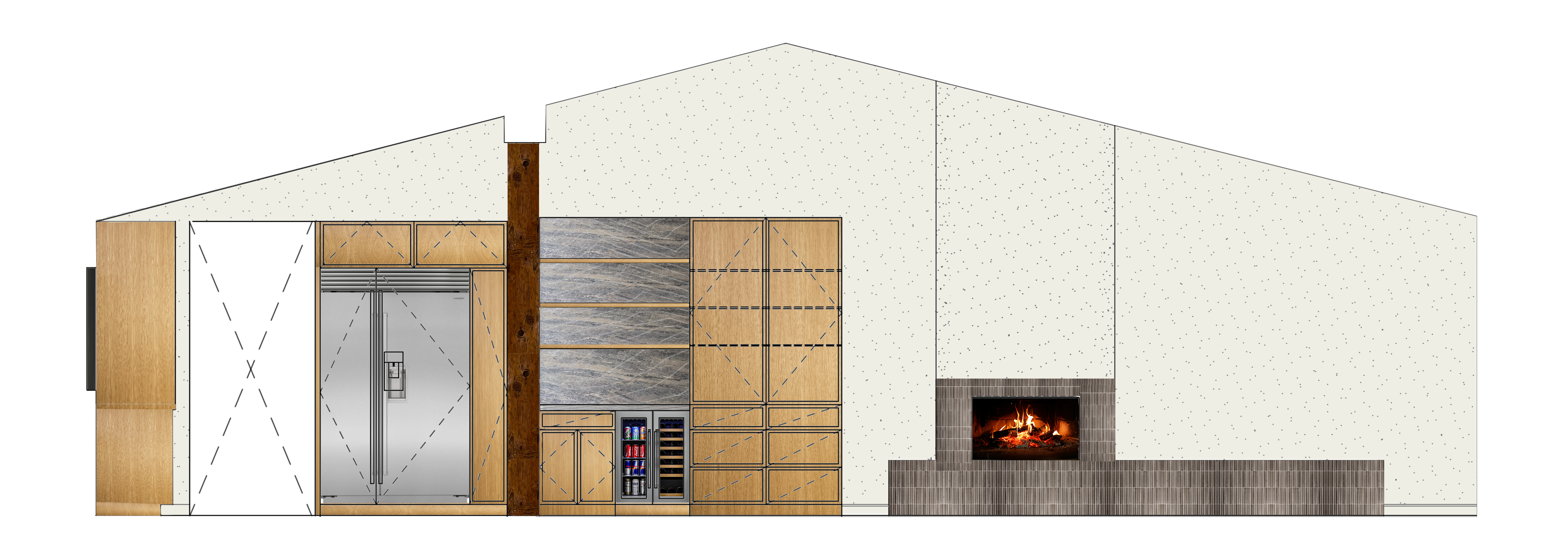 make this interior elevation look realistic the wood tone should be a light tone the cabinetry all is the same wood tone the fire place and hearth tile is daltile remedy zen fluted add soft lighting