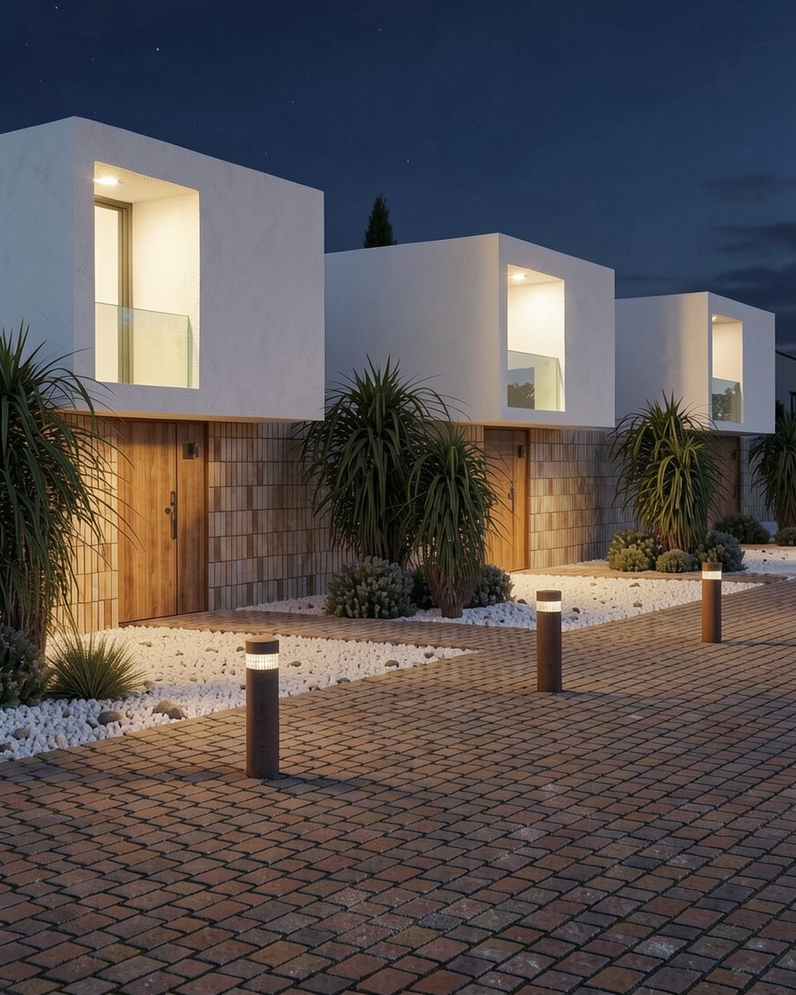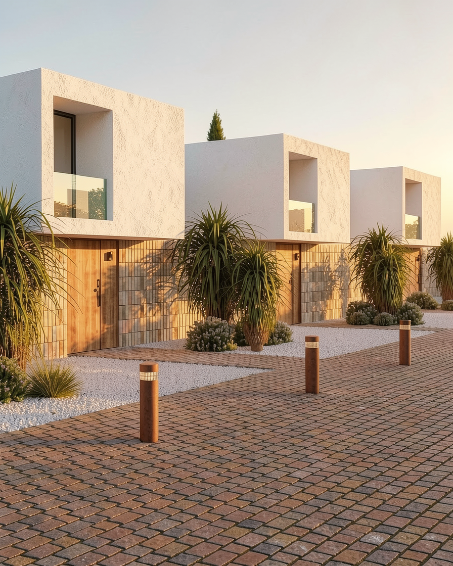 use the provided image as strict base reference preserve the original architecture composition camera position framing proportions and scene layout exactly as they are do not redesign reinterpret or add remove elements objective enhance the image to achieve a high end architectural editorial look refined poetic visually rich and photorealistic without altering the original design materials textures refinement improve realism of all materials stone plaster metal glass pavement add subtle micro texture and natural imperfections introduce slight tonal variation to avoid flat or repetitive surfaces maintain material authenticity no stylization no exaggeration avoid overly sharp noisy or artificial textures light atmosphere strict control preserve the original light direction and logic exactly do not change sun position or shadow orientation refine lighting to be more natural and photographic softer highlights balanced contrast gentle shadow transitions introduce a subtle atmospheric depth very light haze if needed avoid dramatic cinematic or artificial lighting effects reflections surfaces make reflections more physically accurate and slightly softer avoid mirror like or overly perfect reflections ensure correct roughness on all materials color grading apply a subtle editorial color grading slight desaturation for realism maintain a natural warm mediterranean tone if applicable avoid hdr look or excessive contrast vegetation context slightly reduce artificial appearance of vegetation add natural variation in tones and density keep everything controlled and not overgrown overall style architectural digest high end european editorial photography clean calm intentional composition poetic but restrained photorealistic not cgi looking critical constraints very important no change in architecture no change in composition no change in camera or framing no change in proportions no change in layout no added or removed elements no change in light direction no exaggerated textures no dramatic effects