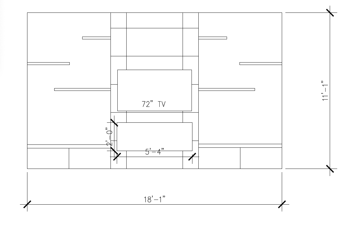 the center section of the elevation should have a modern fireplace with an art tv above the center section should also have 24x48 stone tiles that have a horizontal texture in a natural cream color the two side sections will be the same and be finished in natural plaster the bottom is seating with drawers the drawers will be in a medium oak tone with a taj majal stone top the open shelves above should be in the same medium tone wood architecture