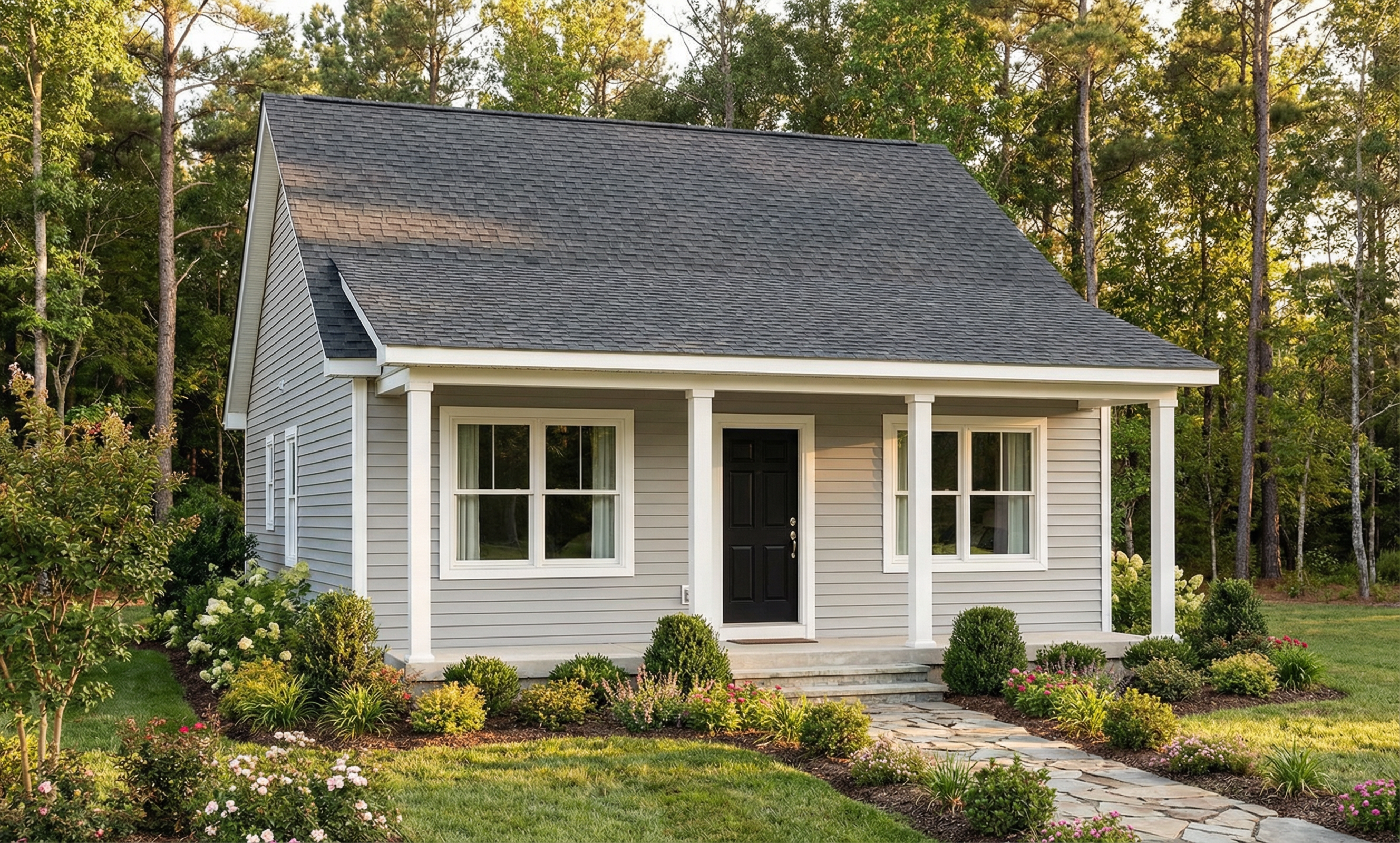 light neutral color coastal style home addition shade in existing home shown behind