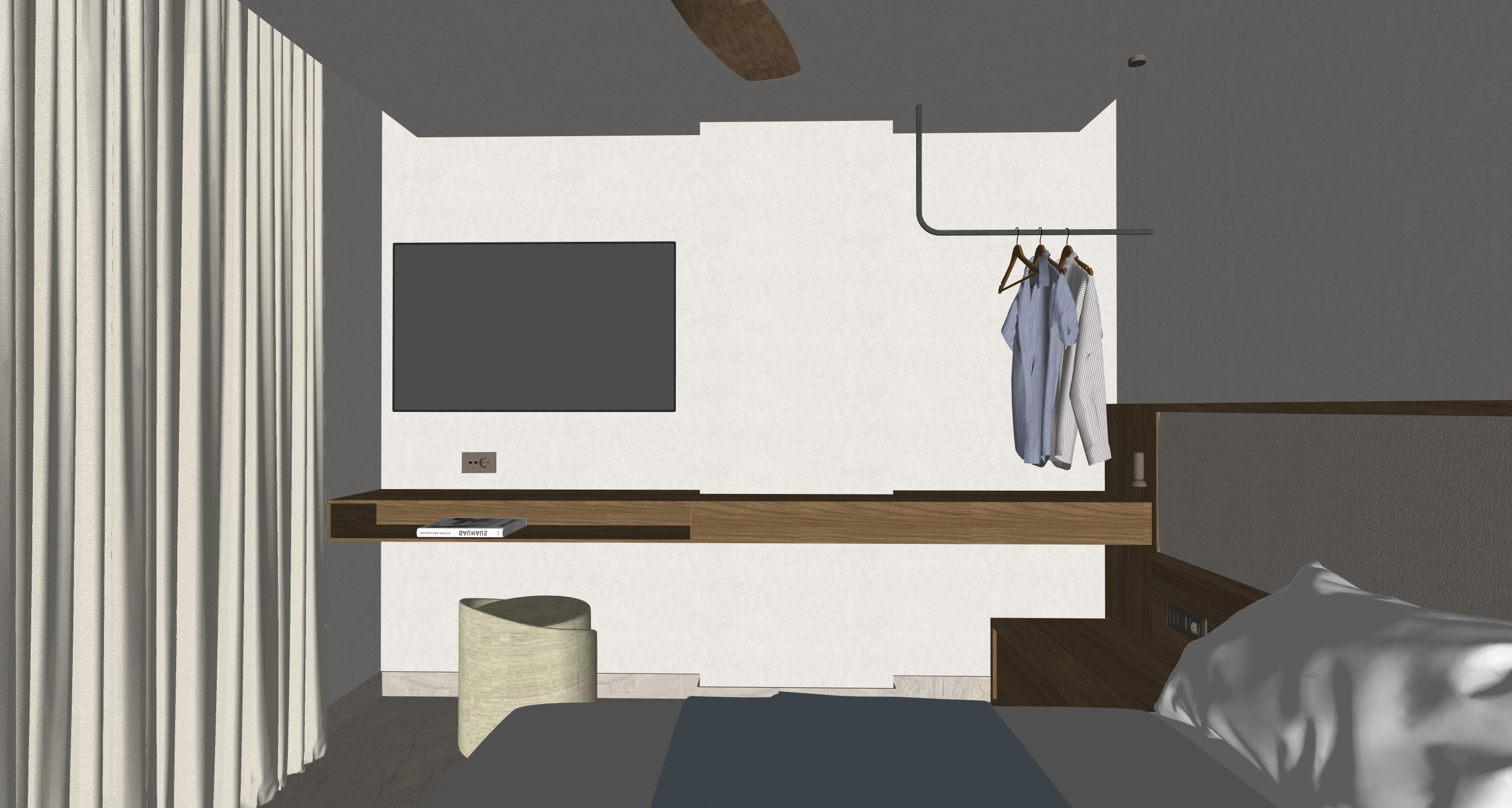 bedroom of a luxury villa wall and ceiling has a light beige texture warm walnut wood the rail on the corner for the clothes is gun metal color earthy tones and tetures on fabrics add led light only below desk between the rail and the tv there is a column