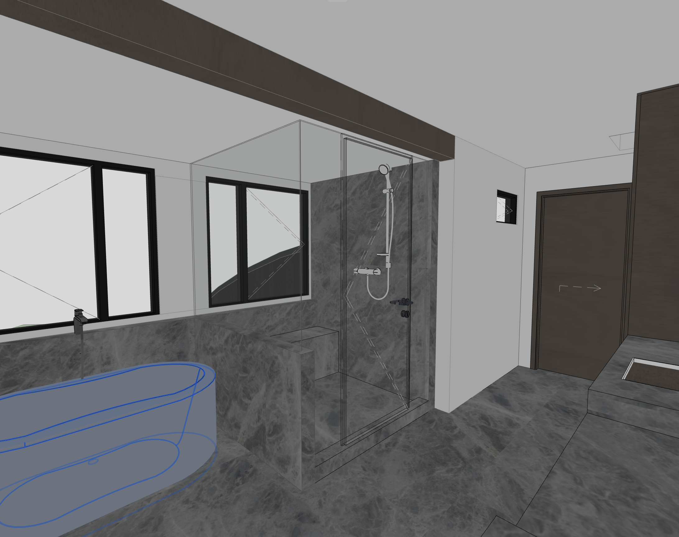 use grigio toscana marble honed for the slab and tile do not add tile to walls use whitewashed oak for the doors and cabinets and beam use gunmetal plumbing fixtures