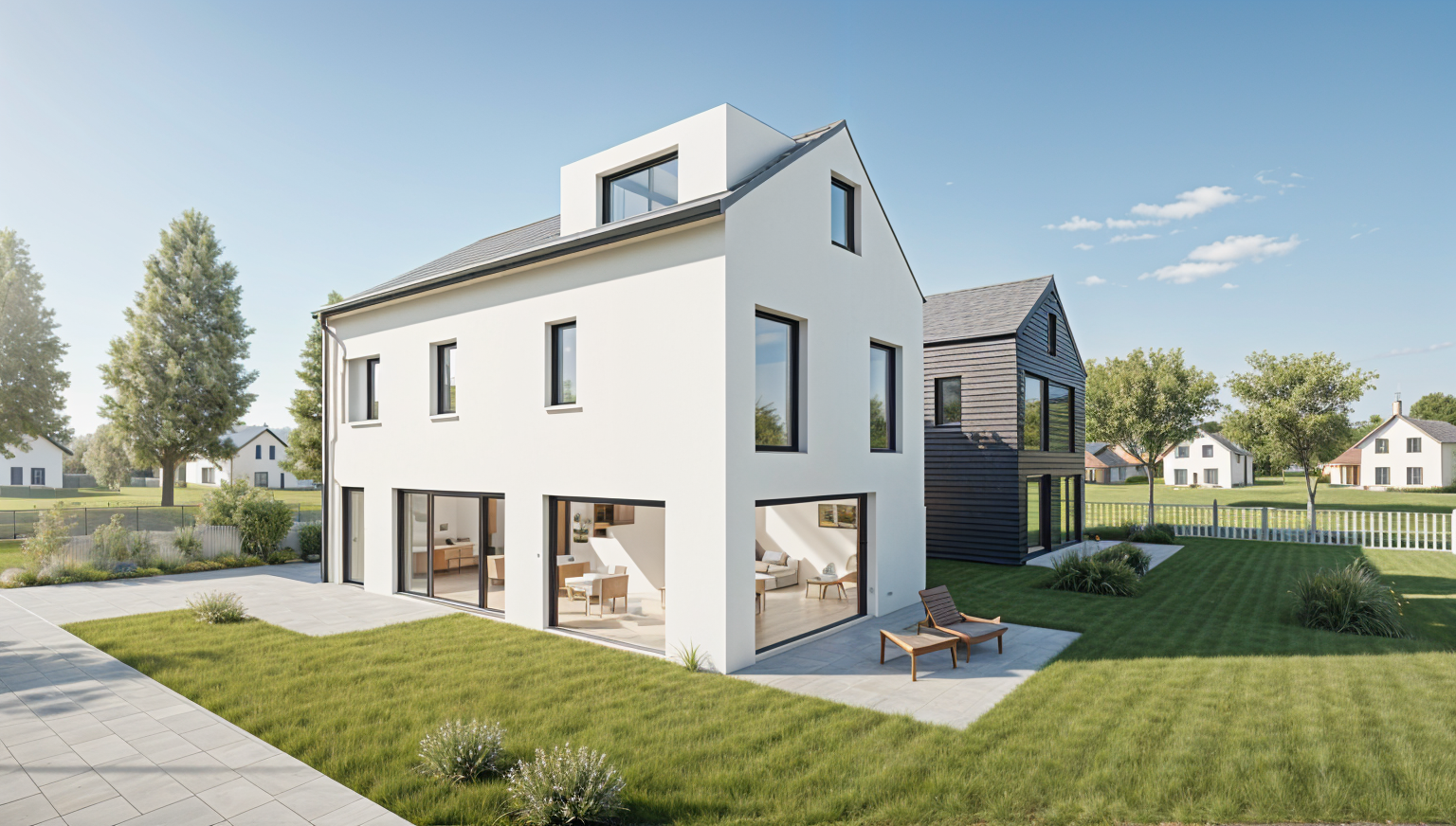 the white space to the left is open the roof is an overhang and acting as a canopy the siding is black vertical hardy board the garages are 9 and 16 not equal