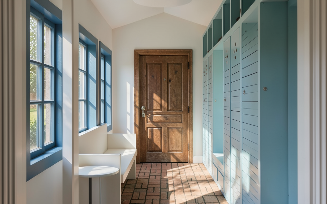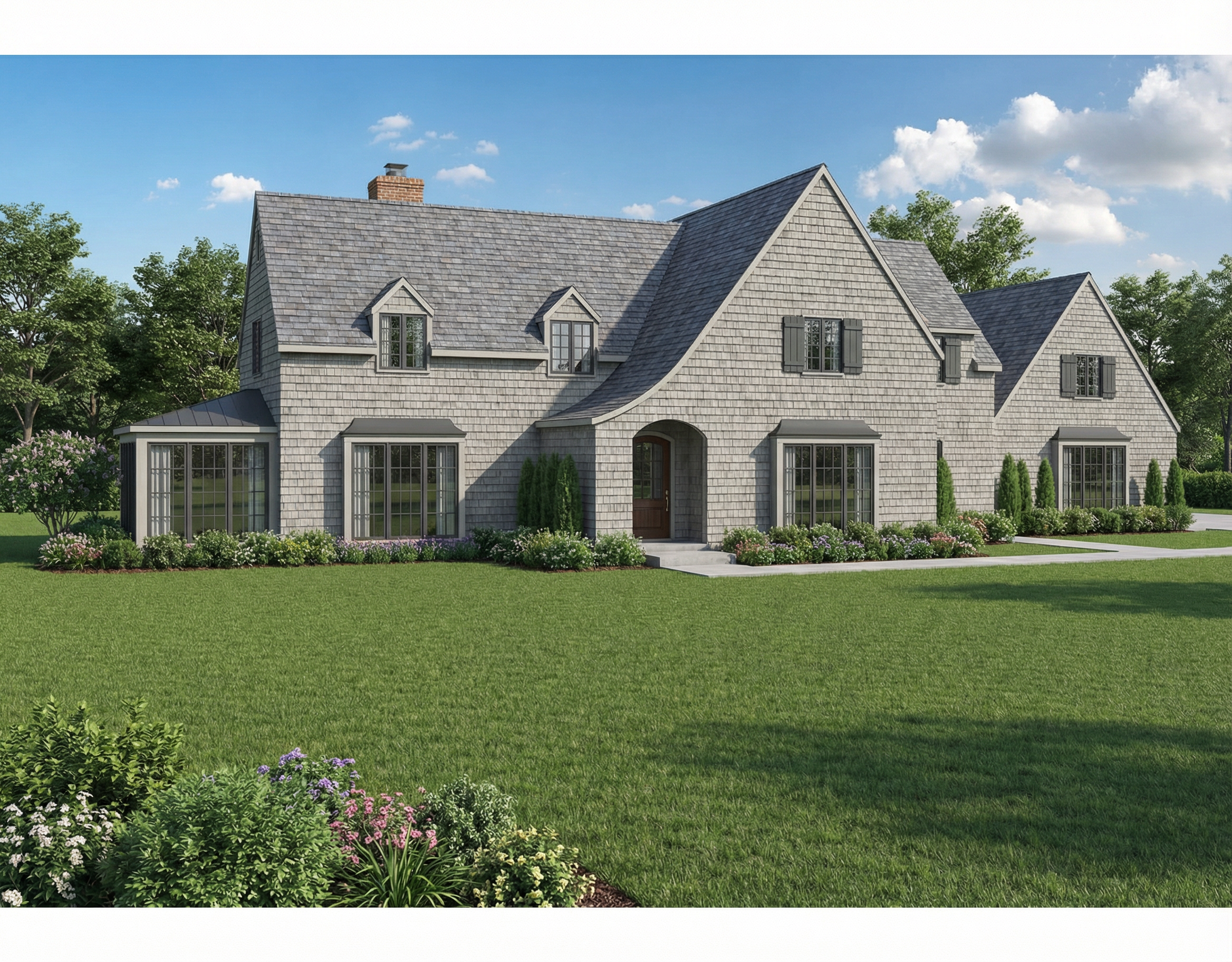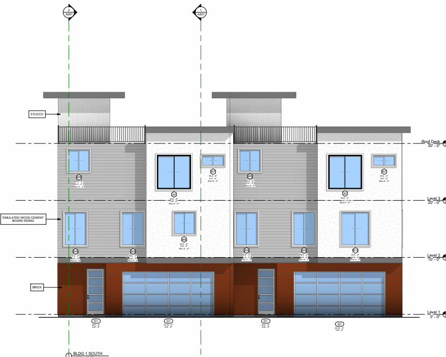 make the brick a dark brown purple color almost black make the stucco a cream color make the siding a dark charcoal color have the image with morning time light and the angle of the image looking at the corner of the buiding so you can see the side and front elevation