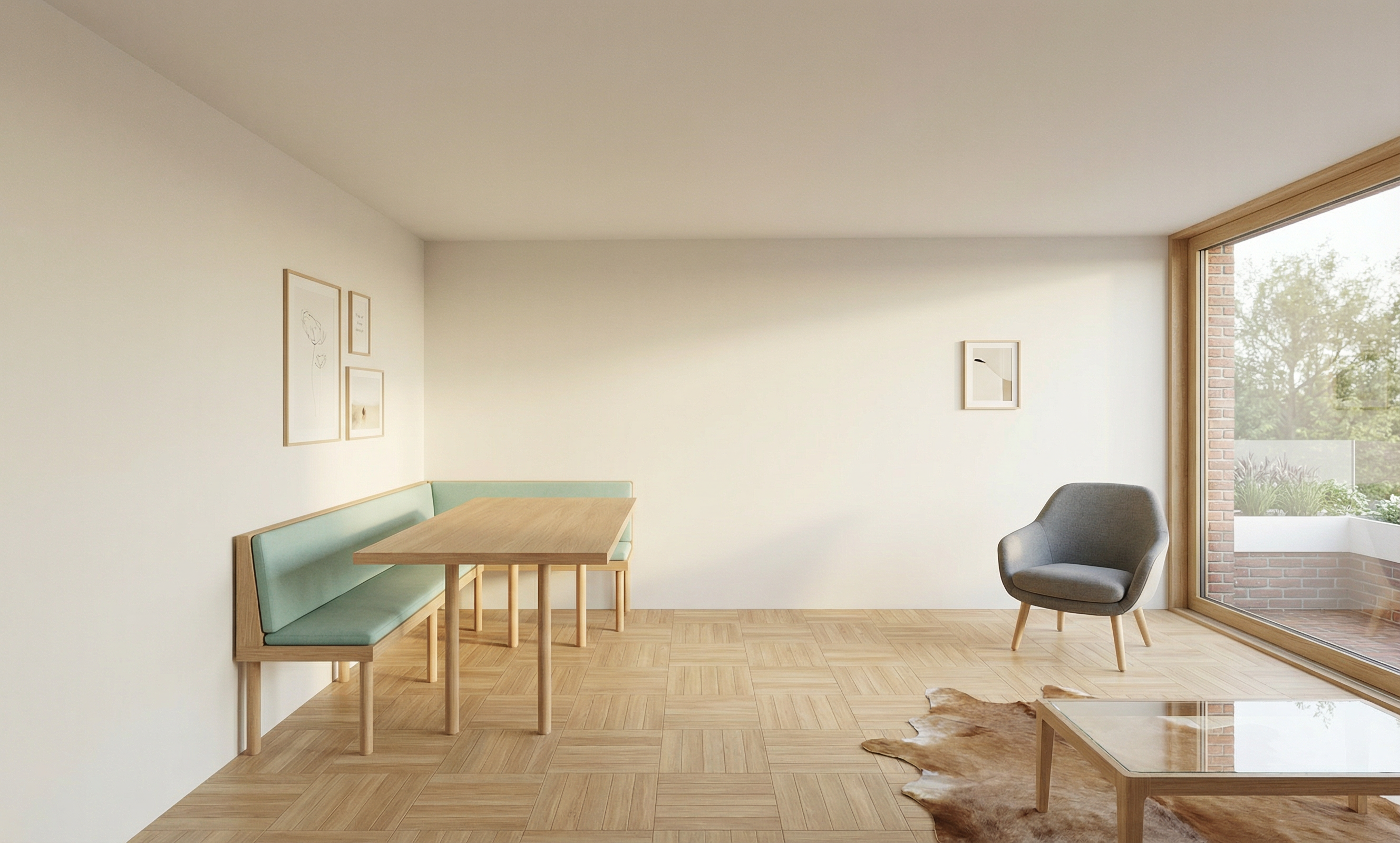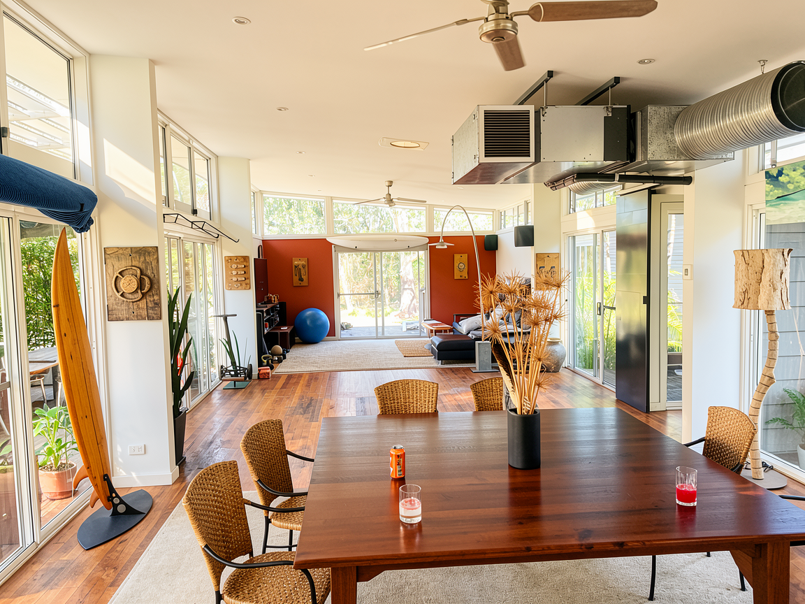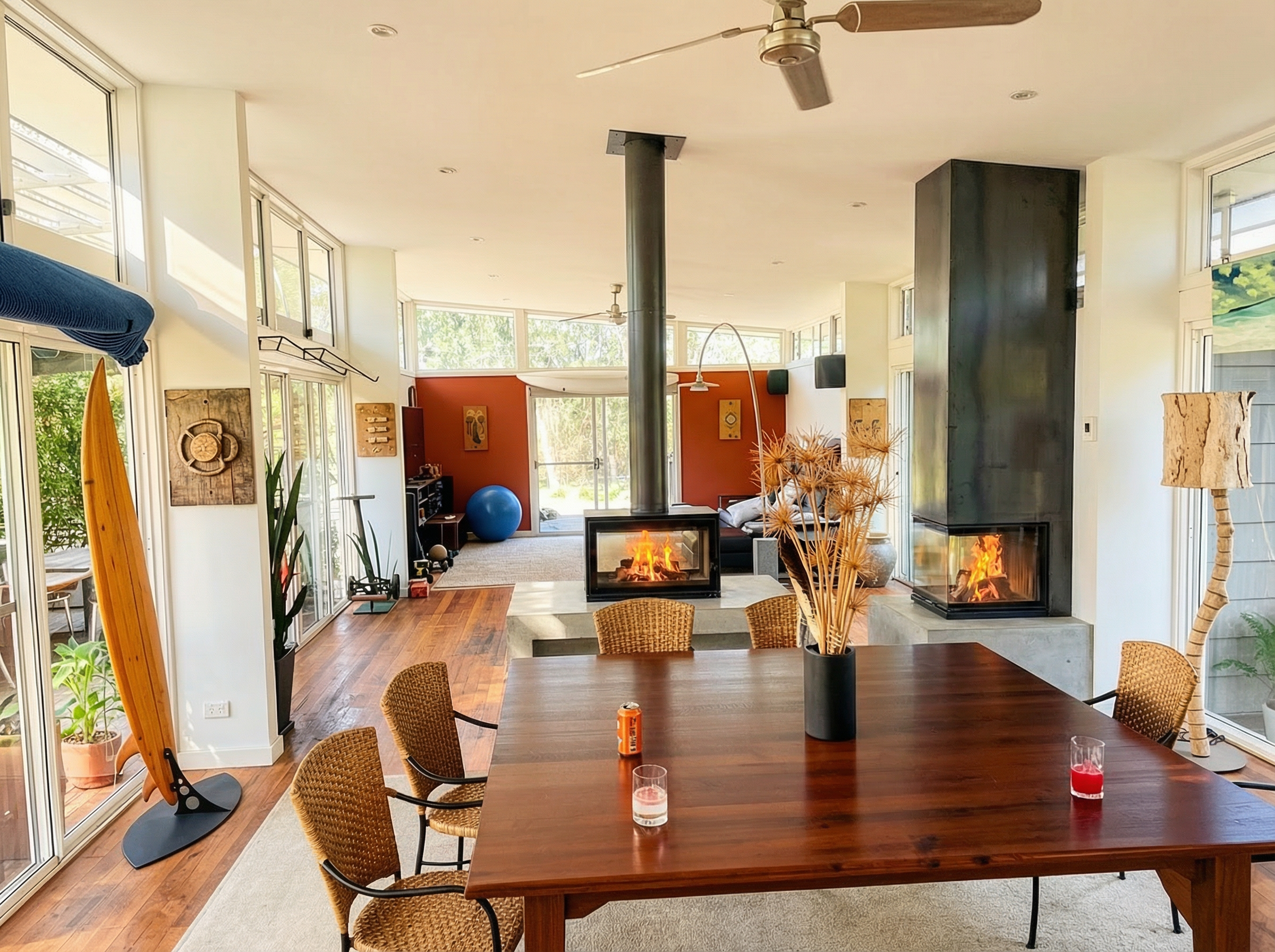add a double sided glass fireplace to back of dining table in the centre of the room it is a radiante 846 2v double sided firebox place it on a 2000mm x 2000mm 250 high concrete plinth with a 100 x 100 recess on the base provide an enclosure from the top of the firebox to the ceiling in dark steel colour remove air conditioning equipment