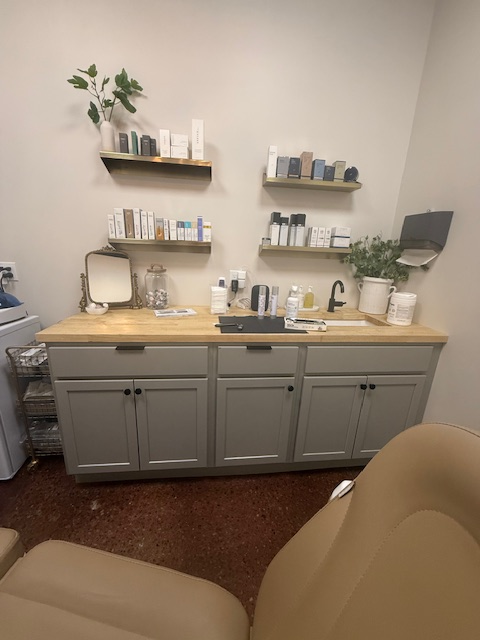 show cabinetry painted a taupe color like in reference image countertop in taj mahal then two full width shelves of countertop out of the stone wall finish as a light cream limestone finish floor stays the same and keep chair in photo