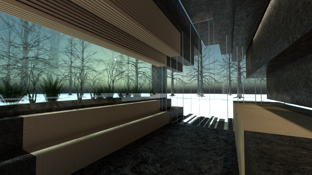 contemporary exterior shot realistic look interior sauna lava rock material wood and glass iceland rocky landscape outside winter architecture
