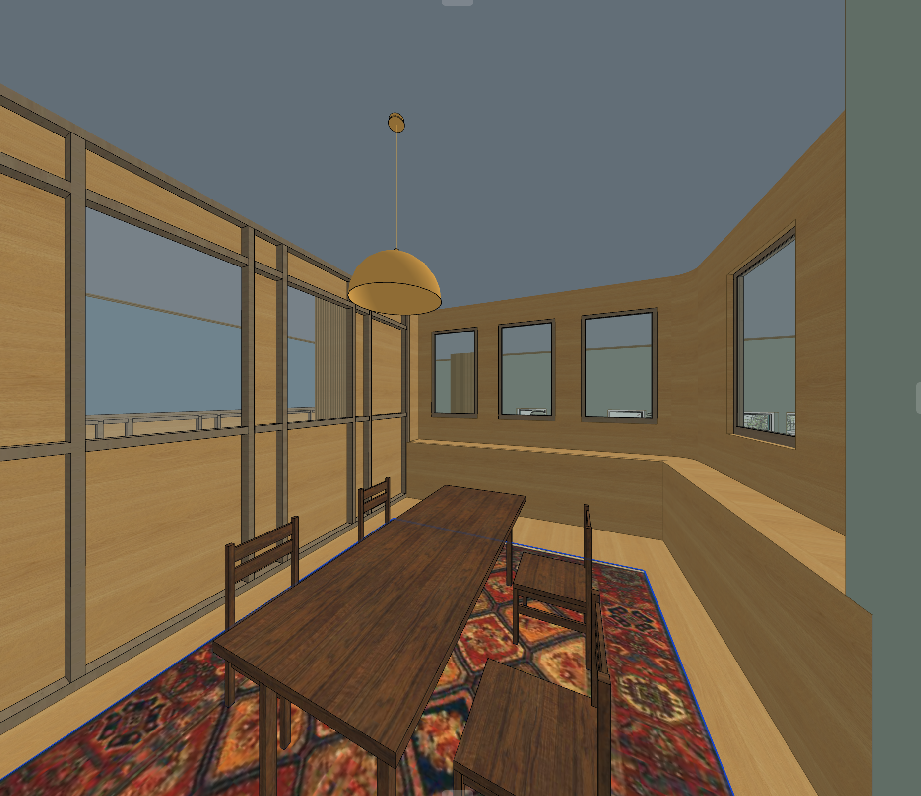 a modern and tranquil study room with a soft blue gray ceiling and warm wooden walls the tables have a textured speckled brown surface while the chairs are upholstered in a muted sage green fabric soft yellow pendant lights hang from the ceiling casting a warm glow a row of books in vibrant colors adorns the built in shelves lush green plants line the divider between the workspaces adding a touch of nature the atmosphere is serene and focused perfect for study or work