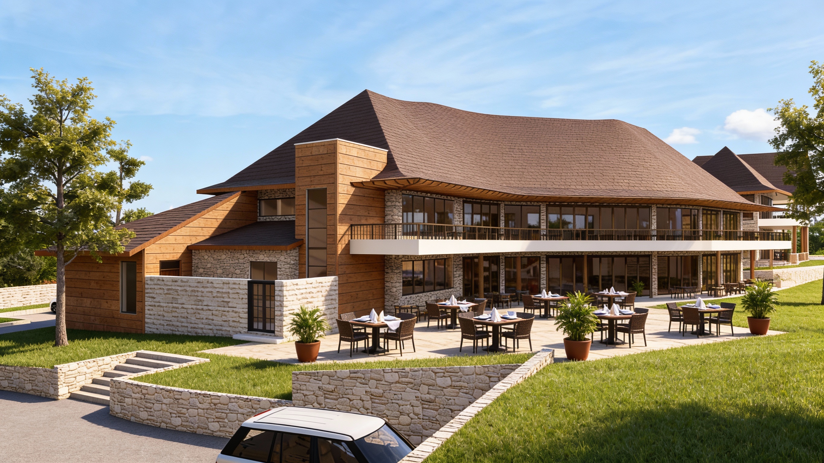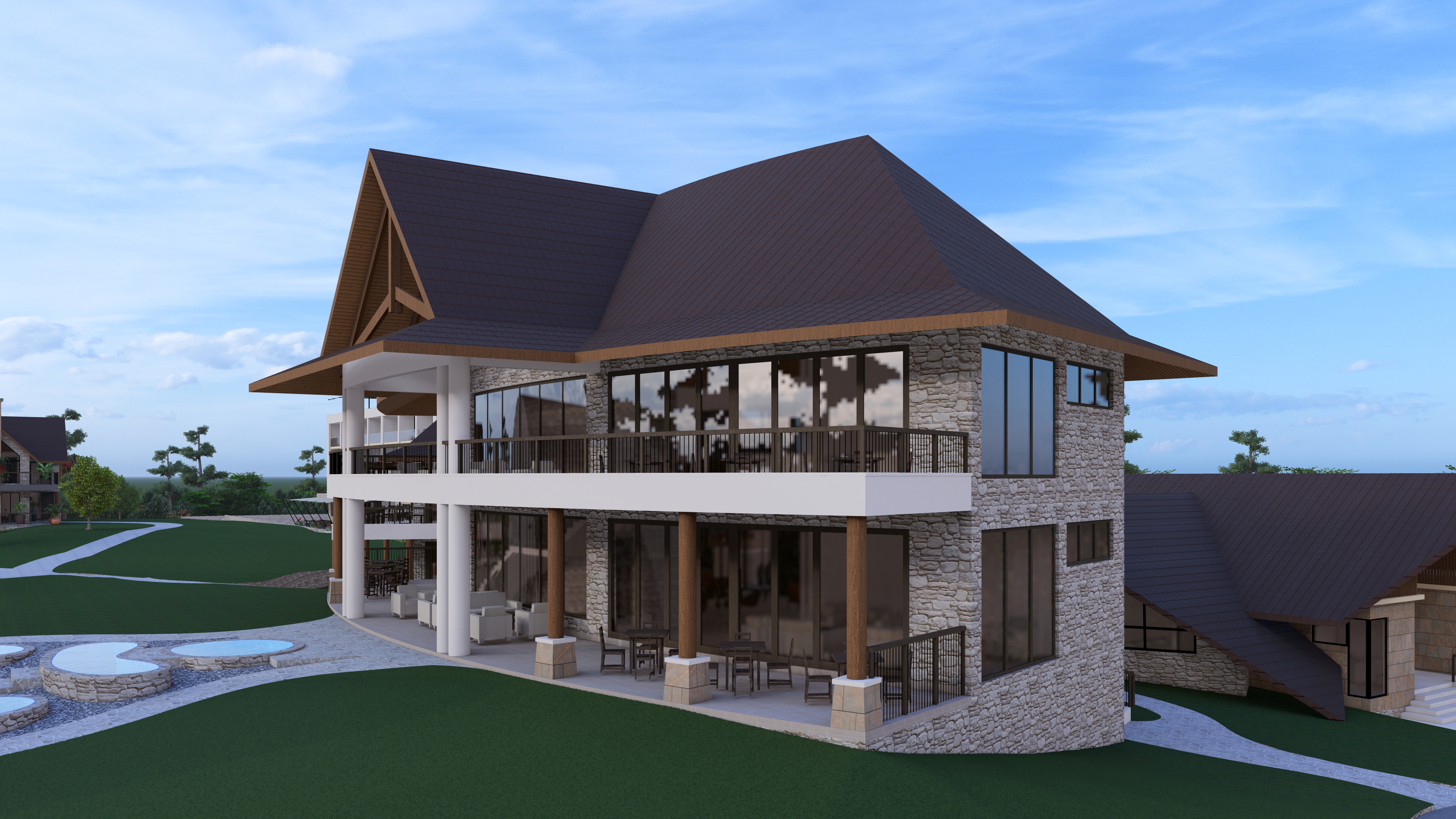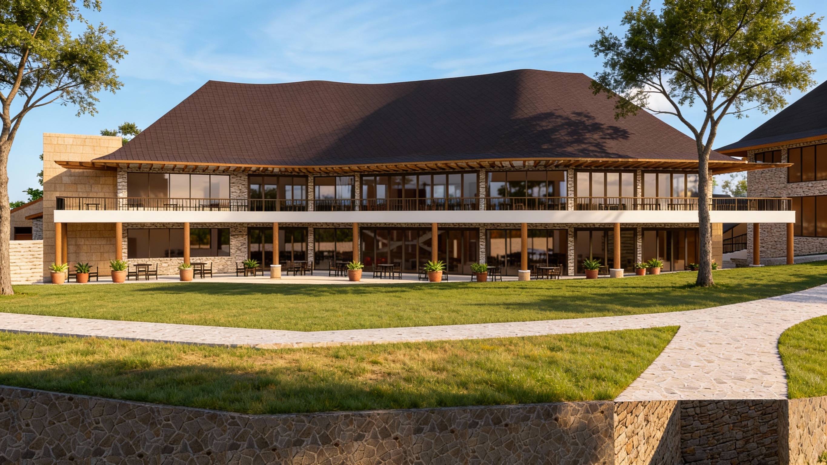 this is a resort restaurant enhance the scene by making it look a bit lived in make grass look more realistic add vry few trees to the compound retain roof texture add some potted plants maintain all materials as they are just enhance colour shades do not adjust or crop the main building p s we have no wooden walls