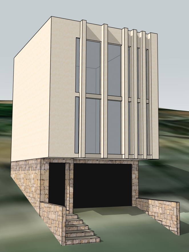contemporary house with stone walls in the lower lever and coloured concrete on the uper levels black painted iron doors for the entrance en the garagge
