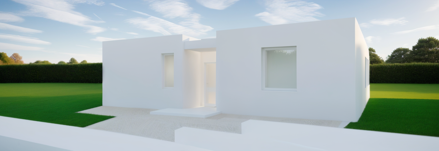 minimalism exterior shot fence white fence in the back white fence in the background path simple white house trees grass in front garden in front grass in front trees in the background level lower in front architecture