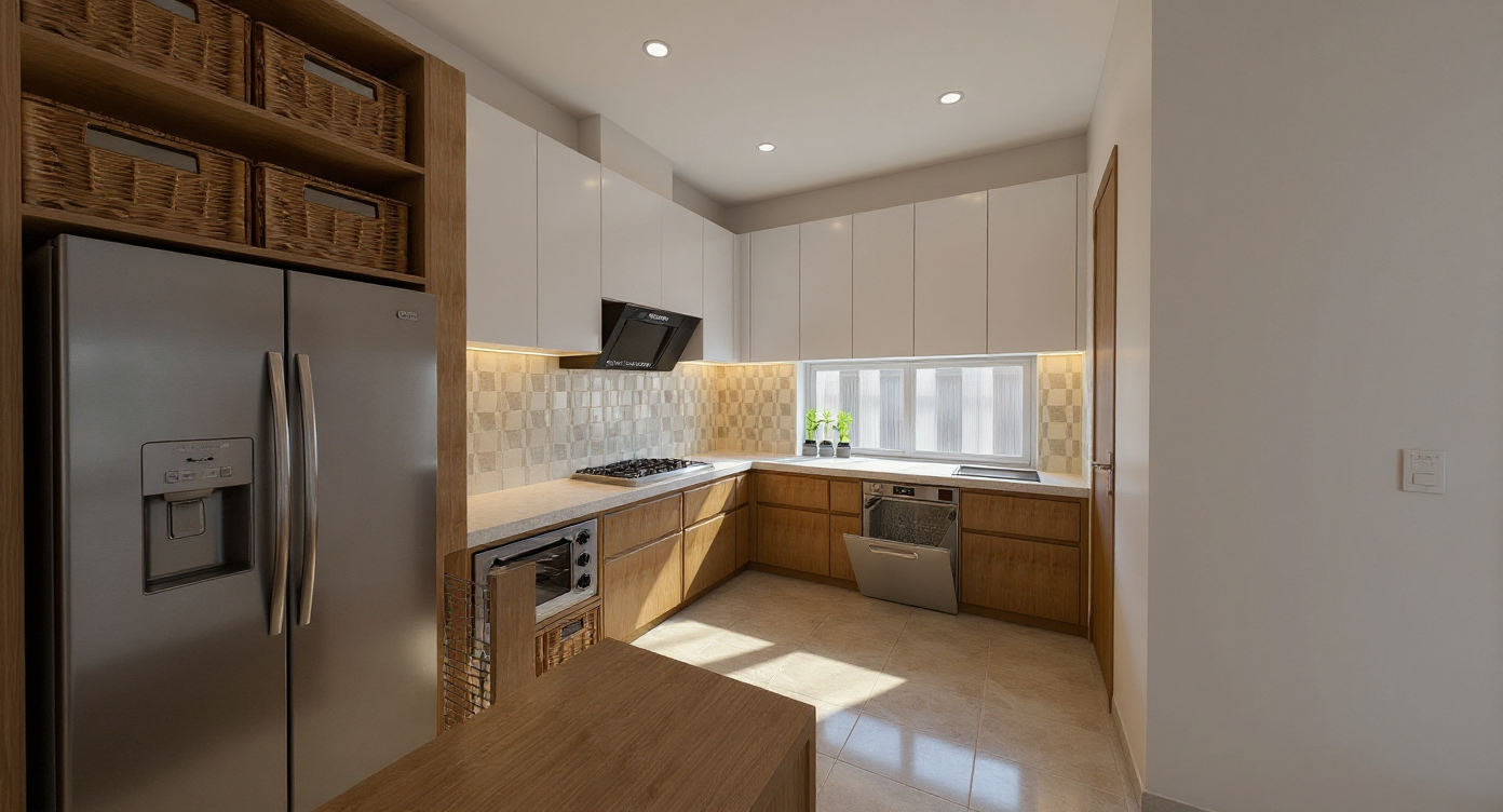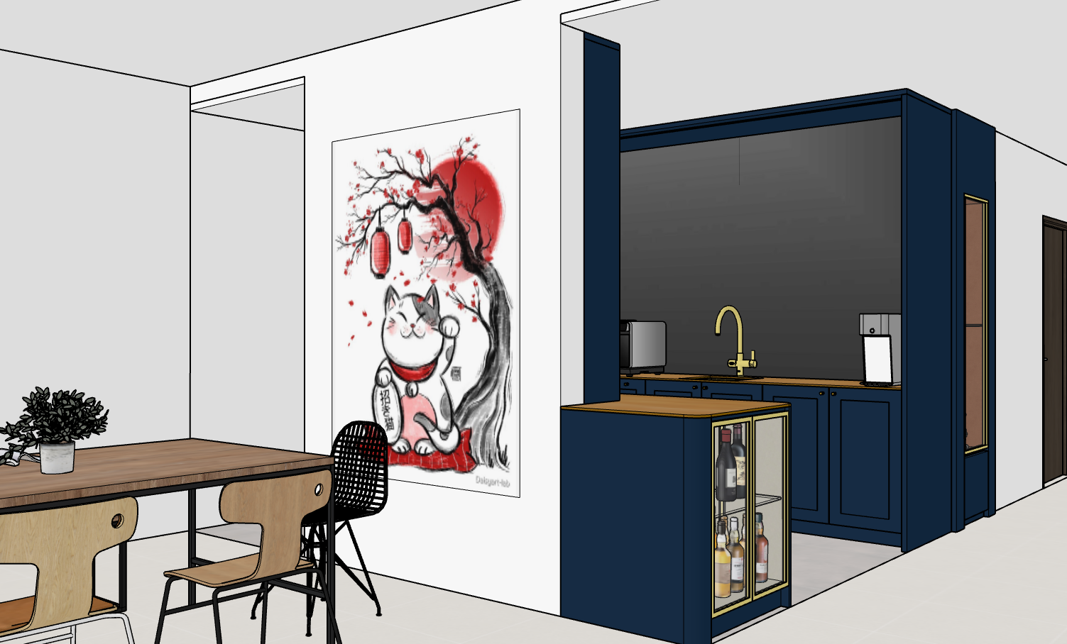 spotlights on ceiling black mirror behind faucet led strip light beige homogeneous floor tiles outside kitchen grey floor tiles inside kitchen