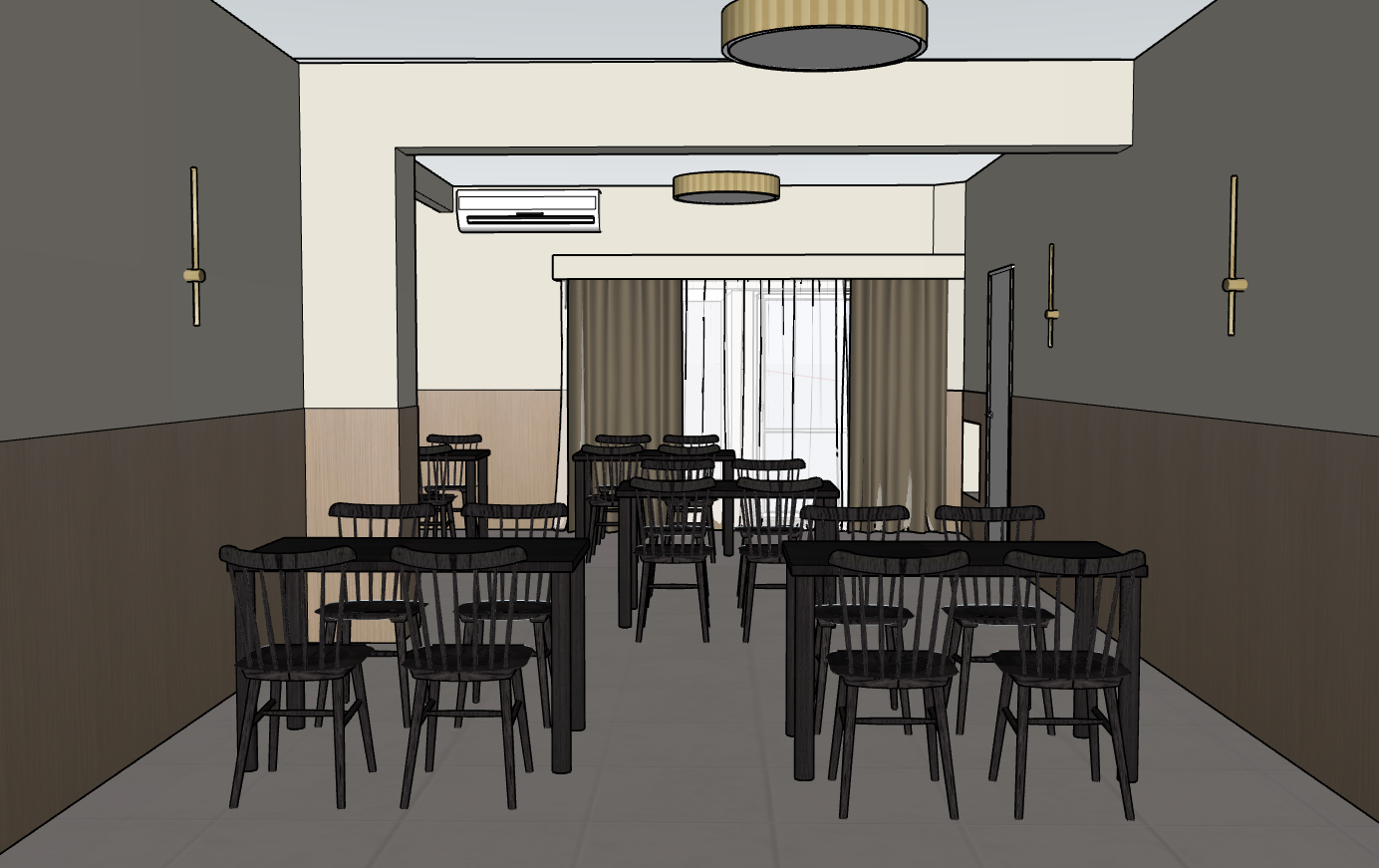 add a smooth flat ceiling add light to the lamp and include a gold ceiling light fixture a flush mount plafond add tableware and some decorations suitable for a restaurant but keep it subtle use warm tones