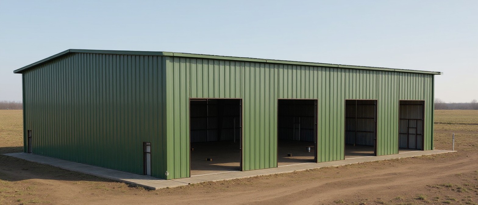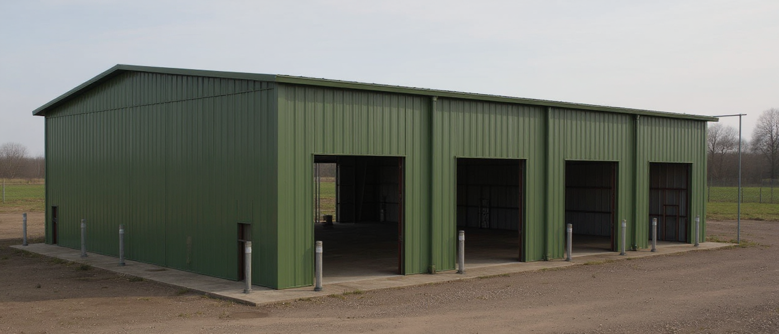steel building mechanics shop maintain colours add bollards on either side of all four garage door openings add industrial setting change building colour to charcoal add 7 yellow bollards beside garage doors 4 feet tall remove 5 yellow bollards on the left of the building