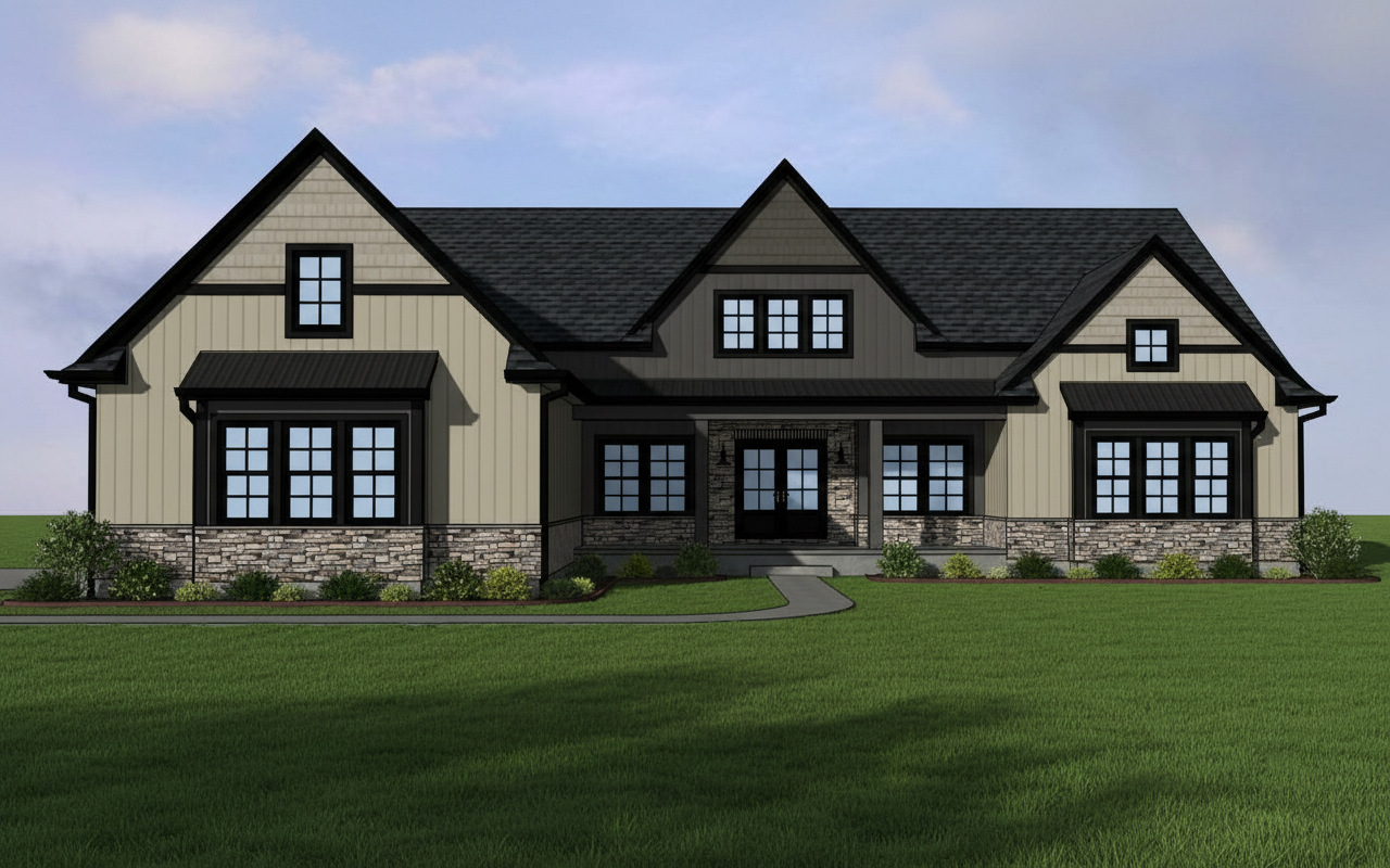 classical exterior shot gray vertical board and batten walls with french windows and a main door with california native plants and trees and grass infront and driveway infront of garage doors architecture