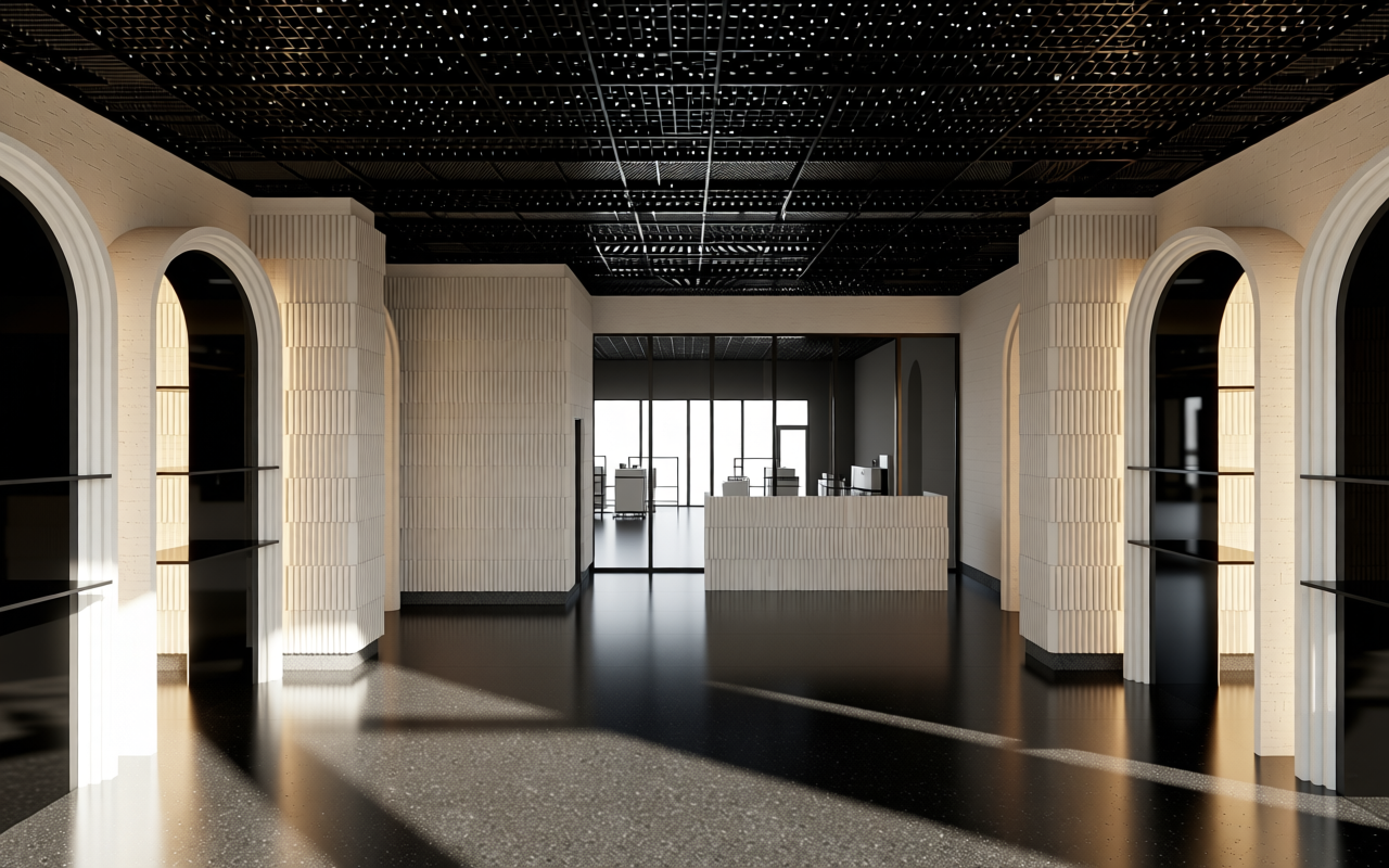 ultra realistic contemporary interior render of a custom 3d printing showroom perfectly frontal symmetrical axial perspective view with strong central vanishing point and deep spatial layering toward a secondary production room strictly preserve all existing architectural elements spatial layout proportions arches wall panelling columns ceiling configuration and camera framing exactly as modelled do not reinterpret add or remove architectural components black pigmented microcement floor with ultra fine terrazzo like microscopic mineral texture extremely delicate embedded aggregate subtle chromatic depth variations refined satin matte polish producing soft warm grazing reflections and elegant tonal movement seamless continuous poured surface with precise junctions at vertical planes walls protruding arches columns and wall claddings executed as refined rough plaster casts in warm off white tone fine handcrafted mineral texture with controlled casting irregularities softened edges and tactile depth alternating angular and rounded panel articulation preserved every architectural arch contains a full height black textured mirror surface with very dark reflective quality almost black glass appearance irregular atmospheric reflections within each arch introduce minimal monolithic shelves made from the same black textured mirror glass thin floating glass planes integrated into the arch thickness perfectly aligned with the existing geometry and not altering arch proportions large wall integrated columns dressed with stacked square panel modules forming rhythmic vertical relief geometry preserved exactly as designed exposed technical ceiling composed of dense modular square expanded mesh panels painted matte black visible infrastructural depth above mesh ceiling reading as a lightweight industrial layer floating above heavy plaster architecture bright diffused daylight only high ambient illumination with soft shadow gradients enhancing ultra fine floor texture and sculptural wall relief no artificial lighting and no decorative staging production room visible in the background containing simplified industrial 3d printing machines replacing placeholder coloured boxes neutral technical equipment volumes with subtle detailing cinematic architectural visualization wide interior lens very high tactile material realism calm experimental gallery showroom atmosphere