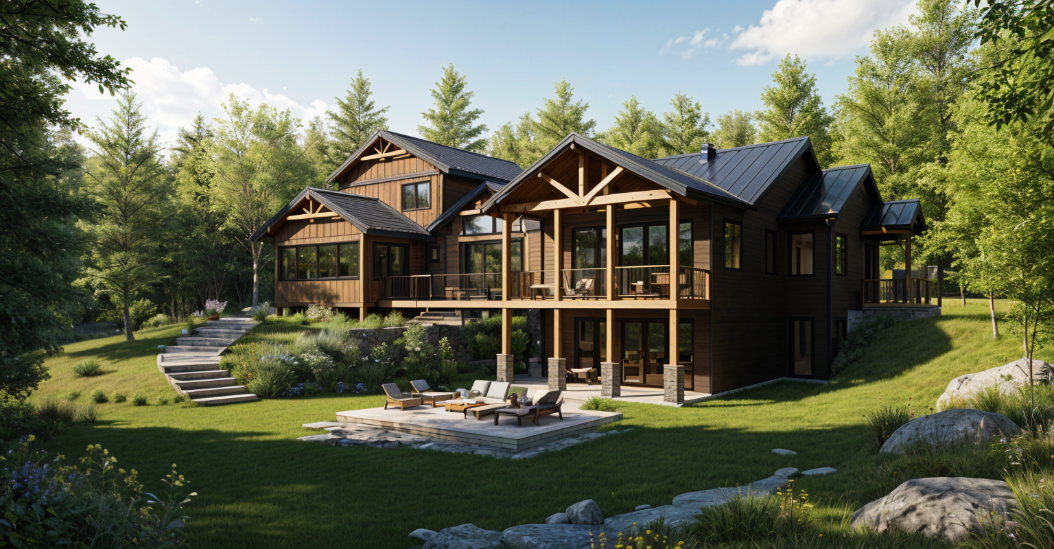 house in a forest quebec sunny morning close to noon black windows black doors black metal roof dark wooden exterior architecture